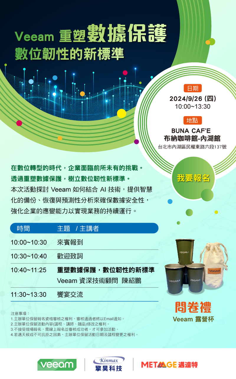 活動訊息: 【Veeam重塑數據保護 數位韌性的新標準】活動 2024.09.26 (四) 台北