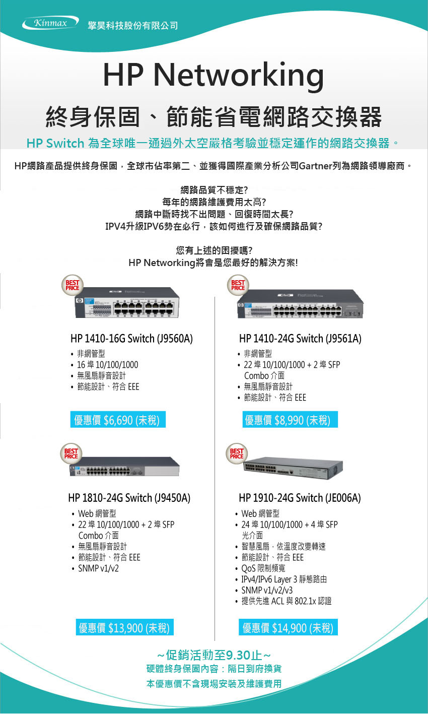 促銷活動 :HP Networking終身保固、節能省電網路交換器