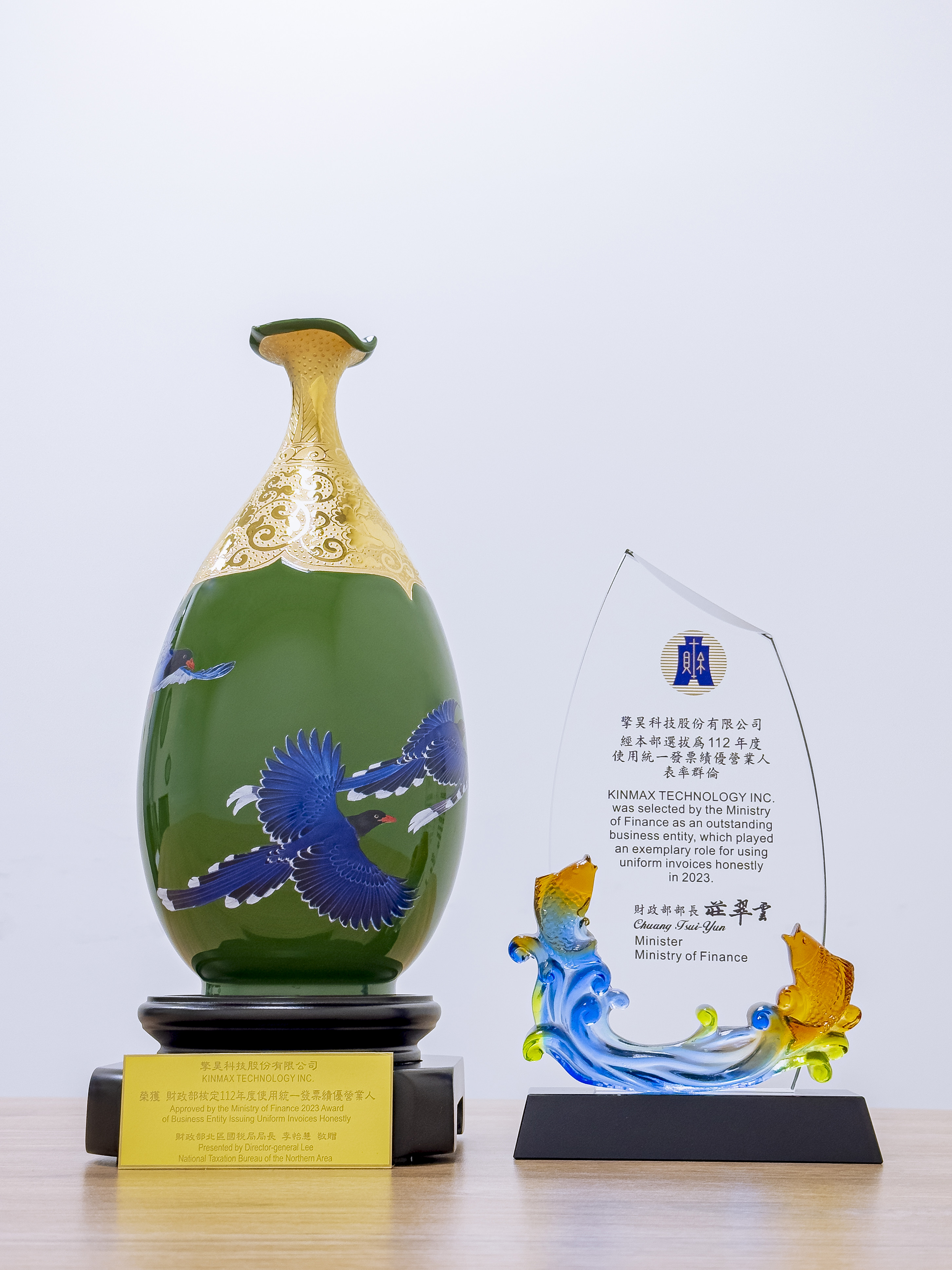 為獎勵營業人誠實開立統一發票及積極配合政策使用電子發票,財政部北區國稅局竹北分局於112年9月5日舉辦頒獎典禮,由竹北分局俞分局長必勤代表財政部莊部長頒發獎盃公開表揚,感謝竹北分局轄內績優營業人積極配合政府統一發票政策及措施;此外,為了表達對所轄績優營業人的敬意與謝意,俞分局長亦代表北區國稅局李局長怡慧致贈臺華窯與藝術家張克齊聯名合作「臺灣藍鵲長尾陣」玉壺春瓷瓶,以國鳥臺灣藍鵲為主題圖飾,象徵績優營業人尊榮顯赫,藍鵲成行長尾陣聲勢壯闊,寓意生意蓬勃,欣欣向榮,讚譽績優營業人厚實國家財政的貢獻,並祝福績優營業人富貴長紅,商機無限。