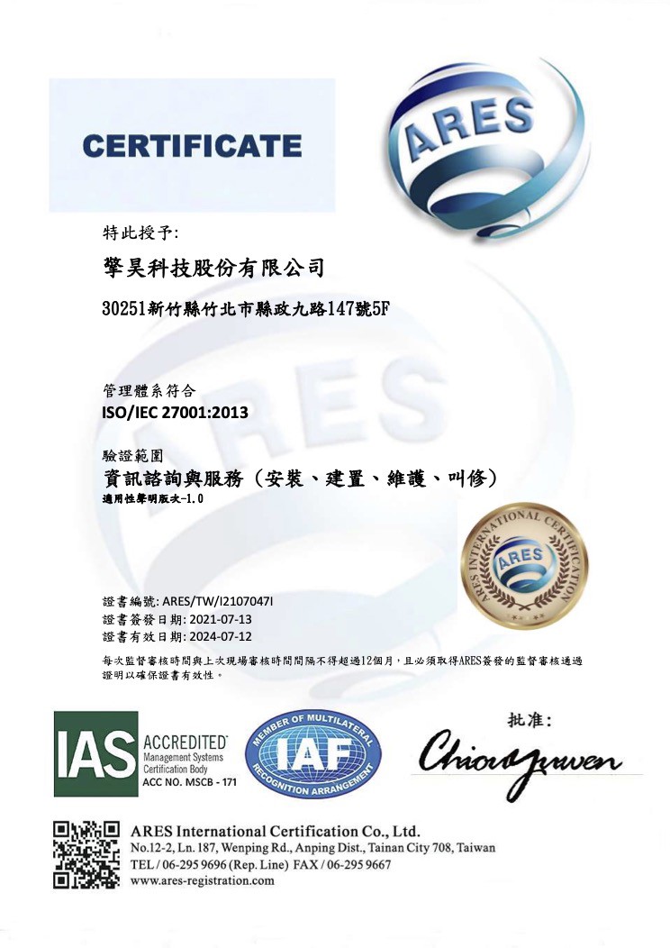 擎昊科技取得 ISO/IEC 27001:2013 資訊諮詢與服務認證