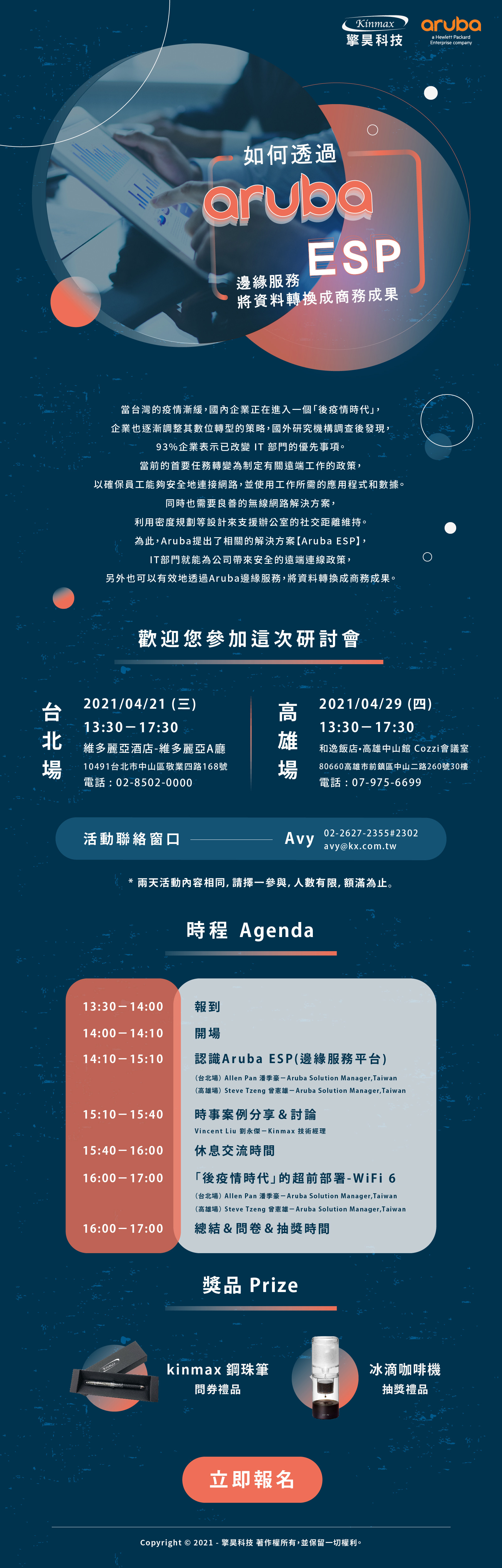 活動訊息:【如何透過Aruba 邊緣服務將資料轉換成商務成果】2021.04.21 & 04.29