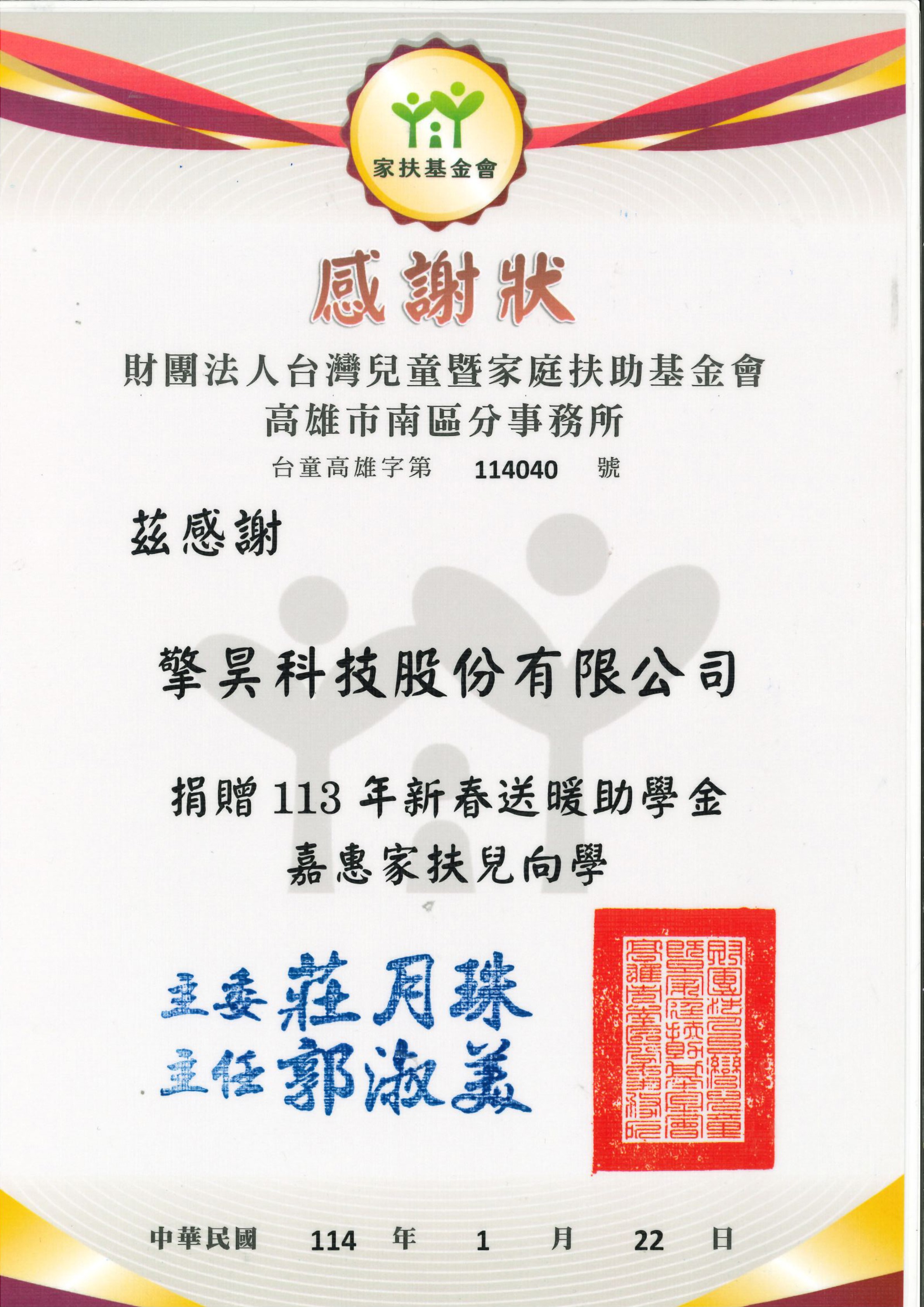 擎昊科技捐贈113年家扶中心新春助學金