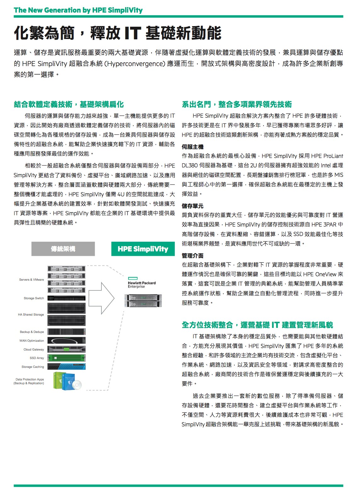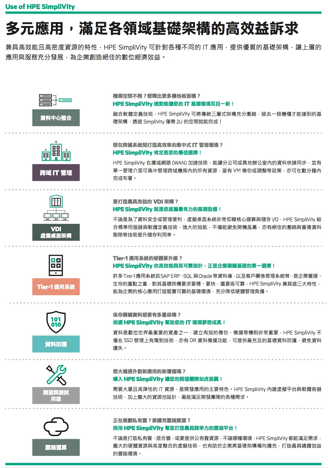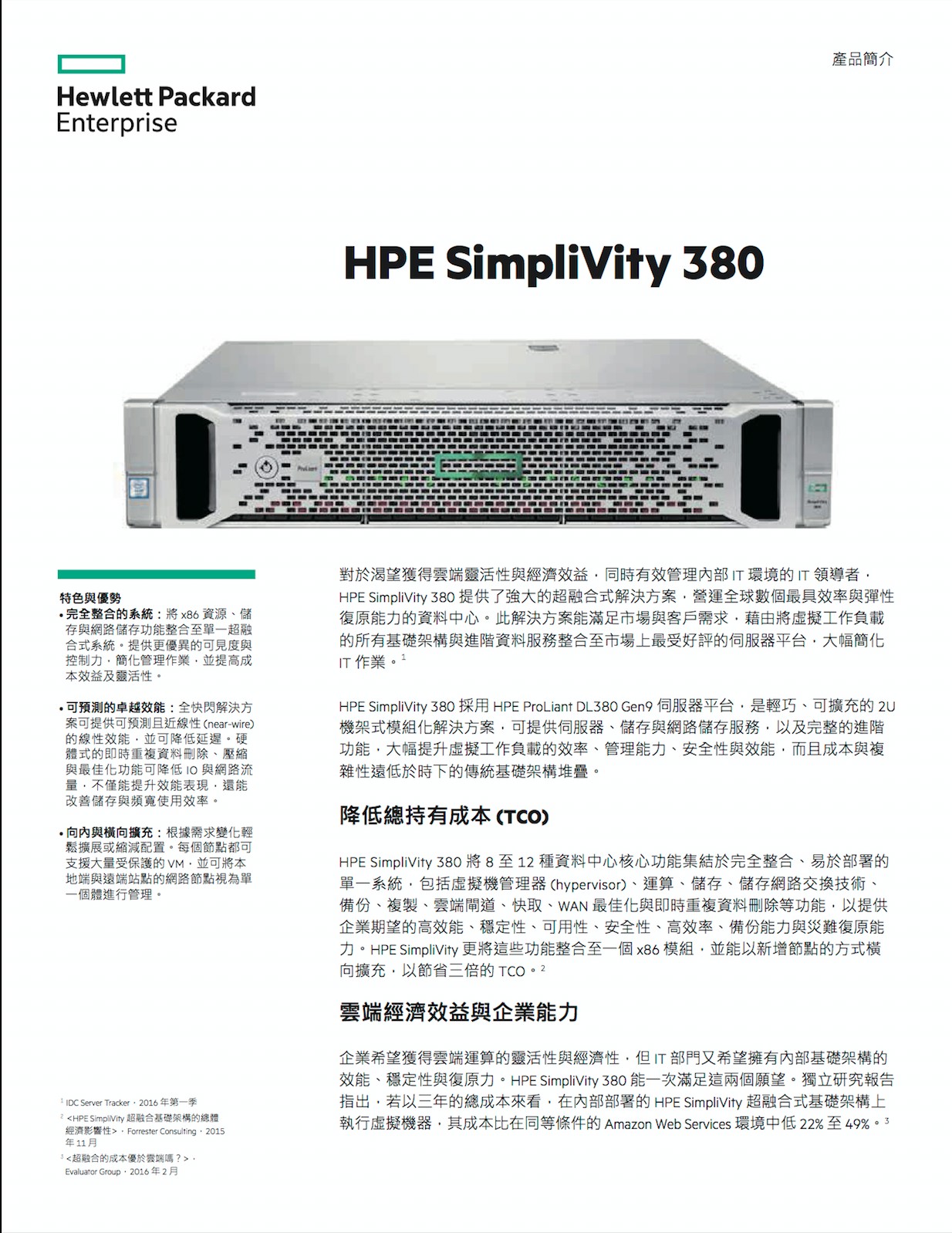 對於渴望獲得雲端靈活性與經濟效益,同時有效管理內部 IT 環境的 IT 領導者, HPE SimpliVity 380 提供了強大的超融合式解決方案,營運全球數個最具效率與彈性 復原能力的資料中心。此解決方案能滿足市場與客戶需求,藉由將虛擬工作負載 的所有基礎架構與進階資料服務整合至市場上最受好評的伺服器平台,大幅簡化 IT 作業。