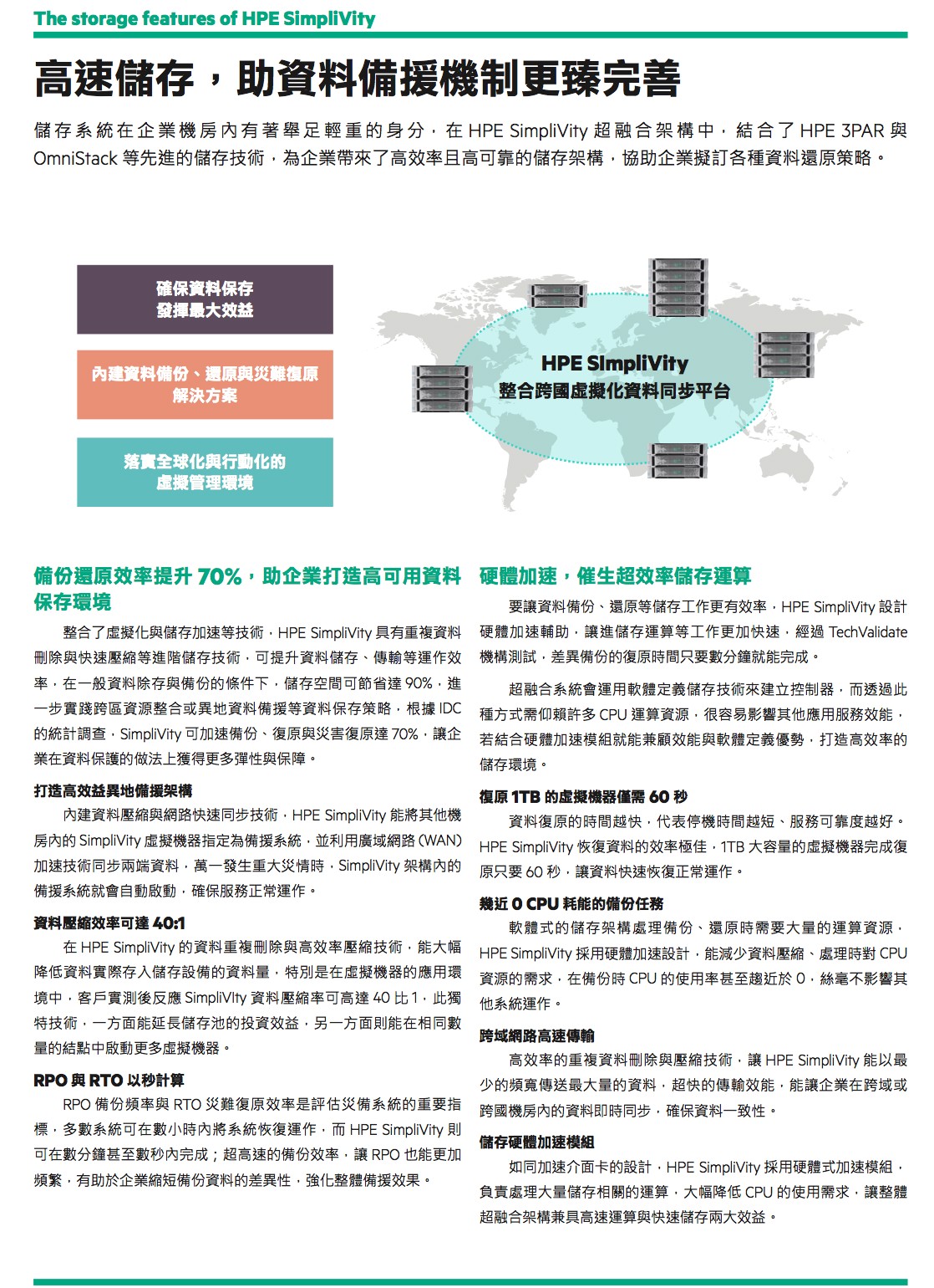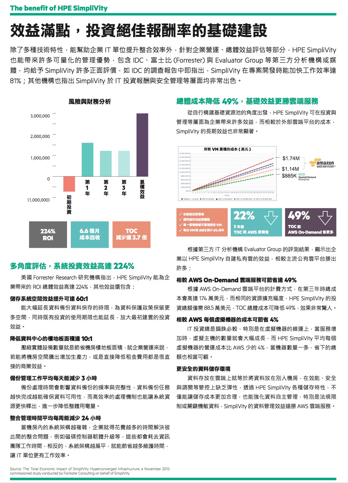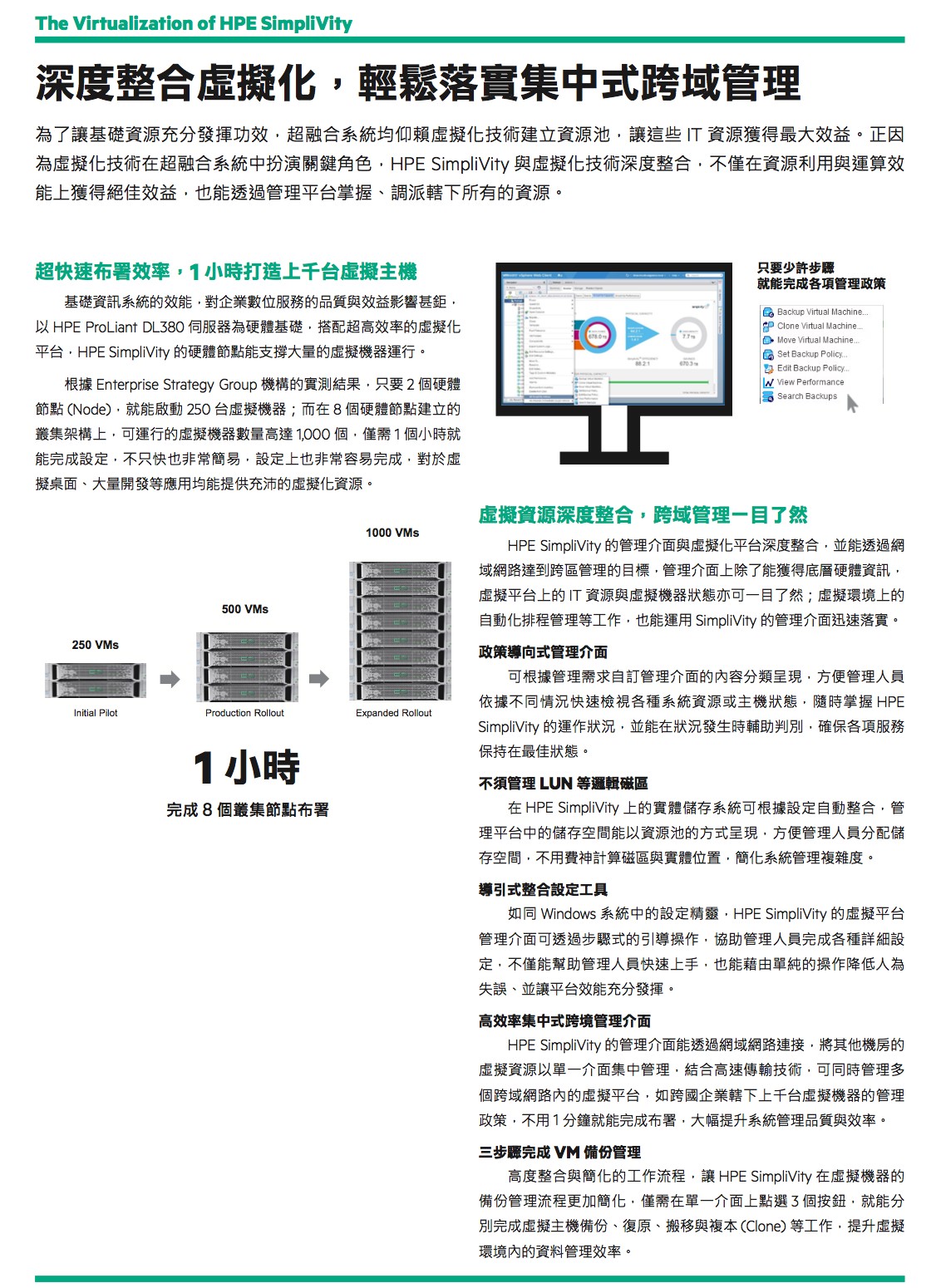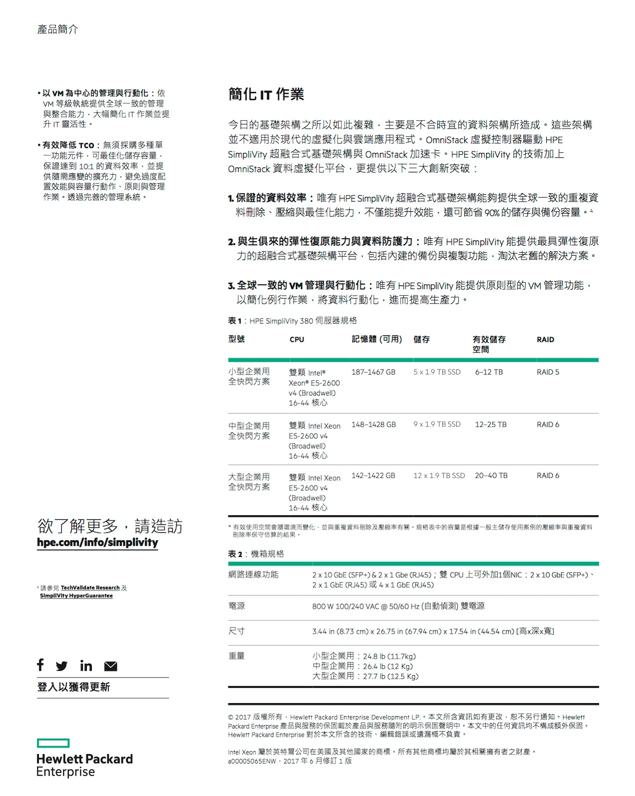 對於渴望獲得雲端靈活性與經濟效益,同時有效管理內部 IT 環境的 IT 領導者, HPE SimpliVity 380 提供了強大的超融合式解決方案,營運全球數個最具效率與彈性 復原能力的資料中心。此解決方案能滿足市場與客戶需求,藉由將虛擬工作負載 的所有基礎架構與進階資料服務整合至市場上最受好評的伺服器平台,大幅簡化 IT 作業。