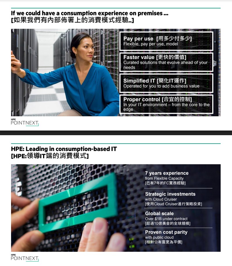 此公用程式服務提供客戶依每次使用付費的方式,來存取HPE 伺服器、儲存裝置和網路設備。緩衝區容量會在客戶需要前預先部署,唯客戶使用該容量時才需付費,但需受最低承諾之限制。在客戶使用緩衝區容量後,我們會根據客戶的容量預測來進行容量補充規劃。如此可提供充足的前導時間,以便根據客戶的新需求來升級容量和維護緩衝區容量。