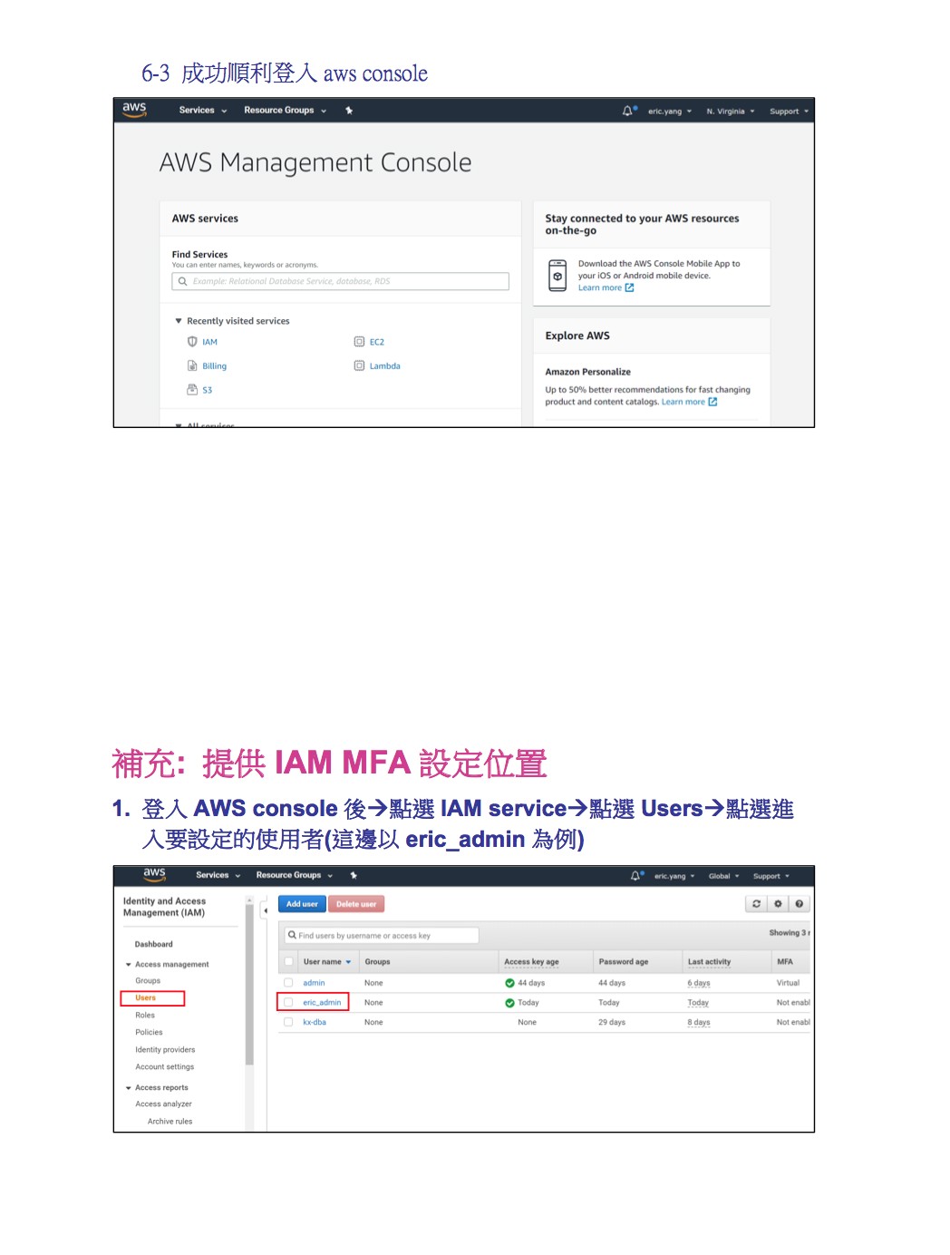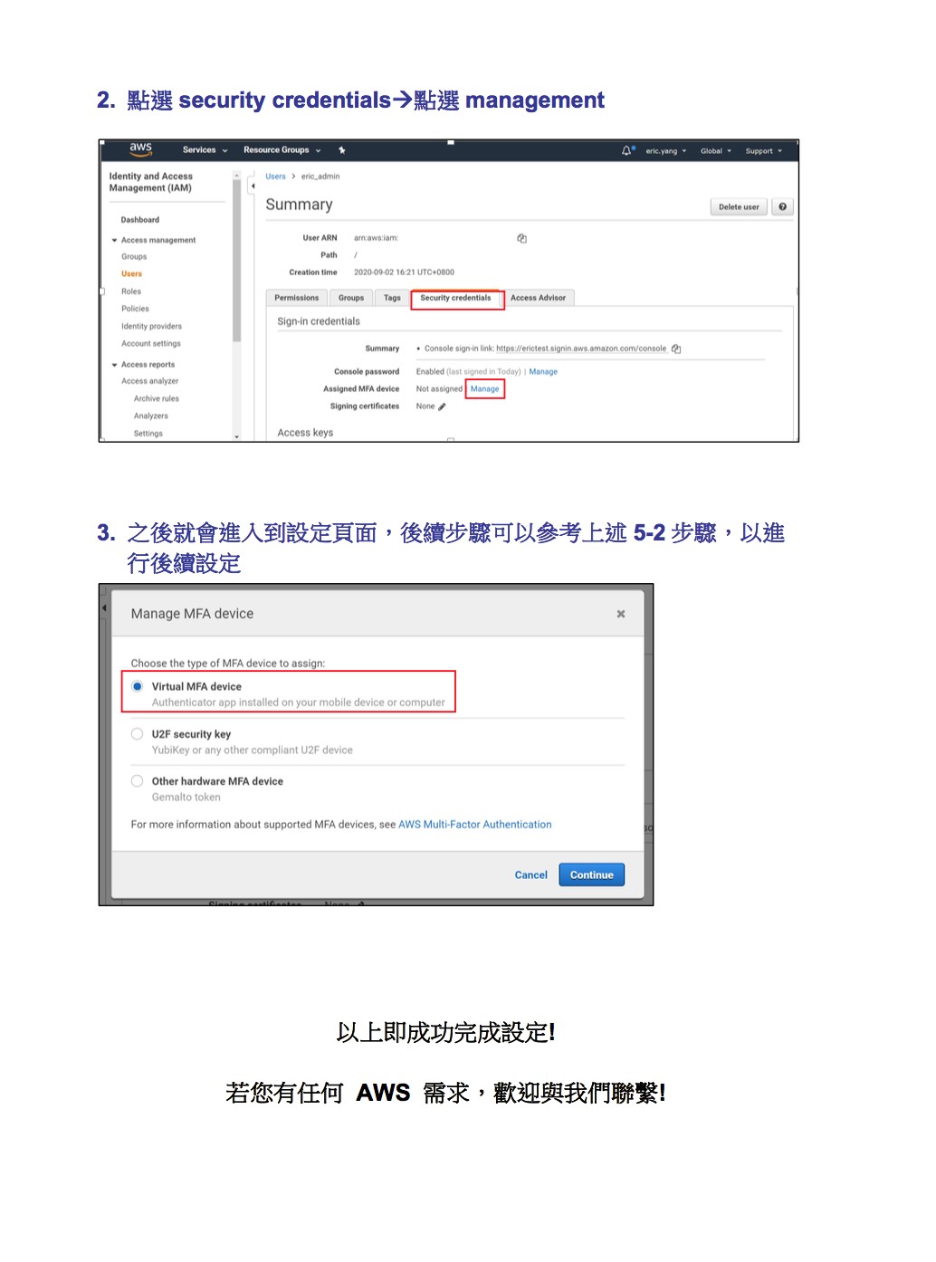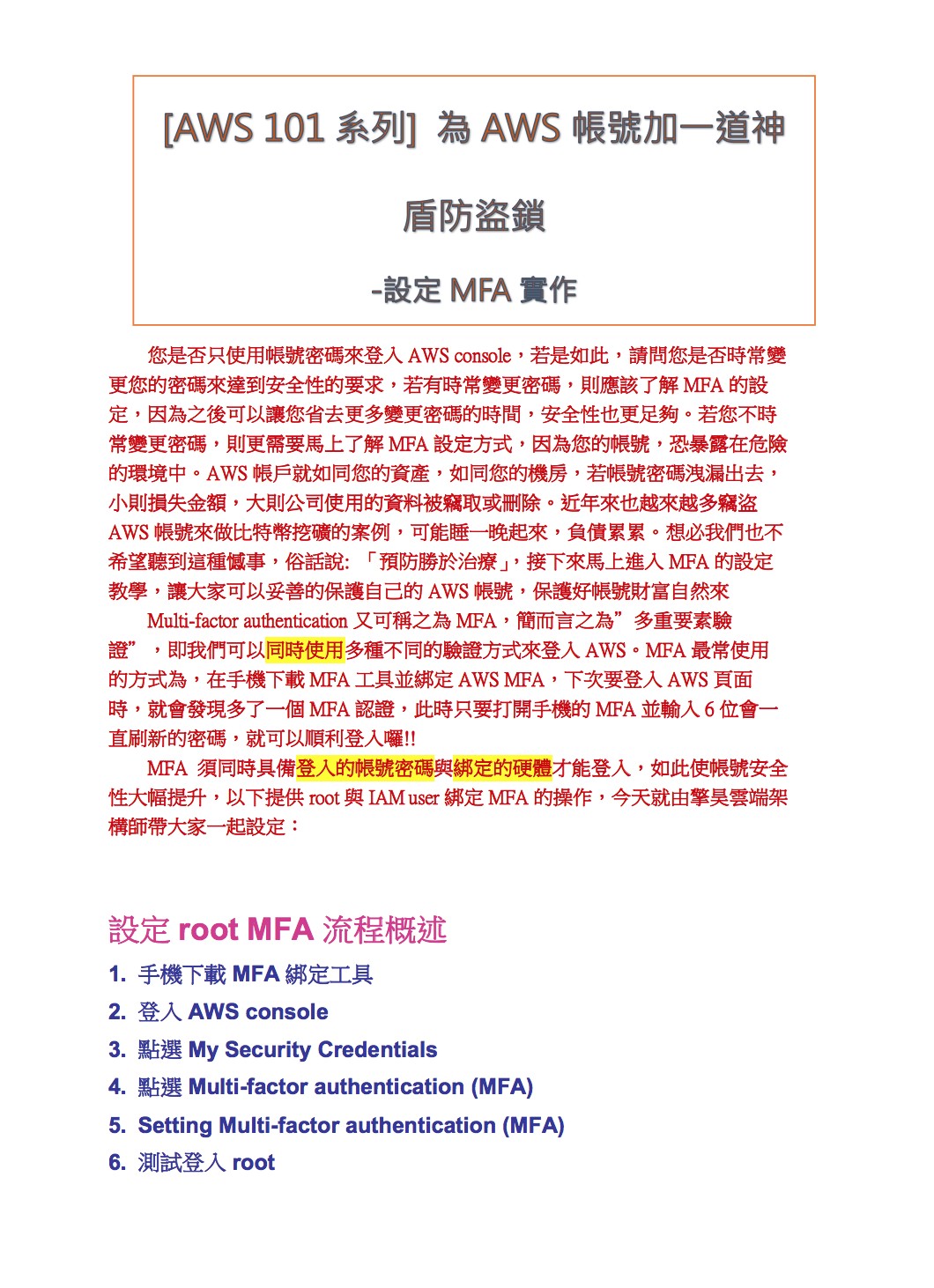 您是否只使用帳號密碼來登入AWS console?若是如此,請問您是否時常變更您的密碼來達到安全性的要求,若有時常變更密碼,則應該了解MFA的設定,因為之後可以讓您省去更多變更密碼的時間,安全性也更足夠。若您不時常變更密碼,則更需要馬上了解MFA設定方式,因為您的帳號,恐暴露在危險的環境中。AWS帳戶就如同您的資產,如同您的機房,若帳號密碼洩漏出去,小則損失金額,大則公司使用的資料被竊取或刪除。