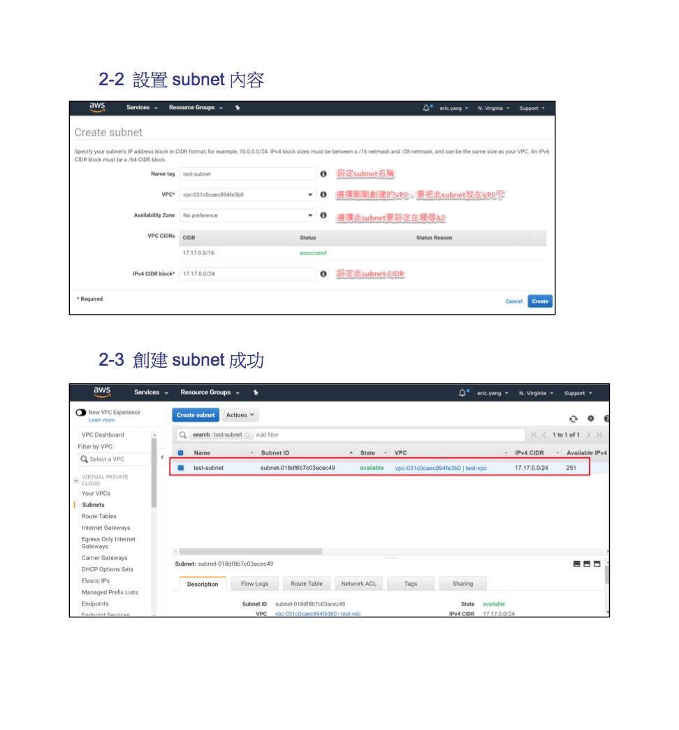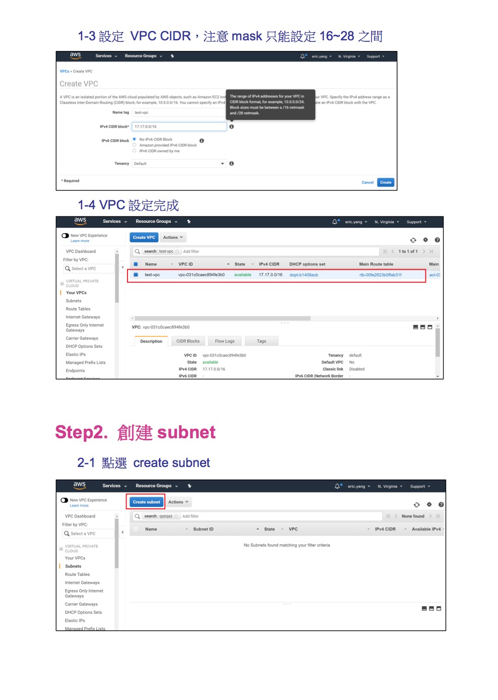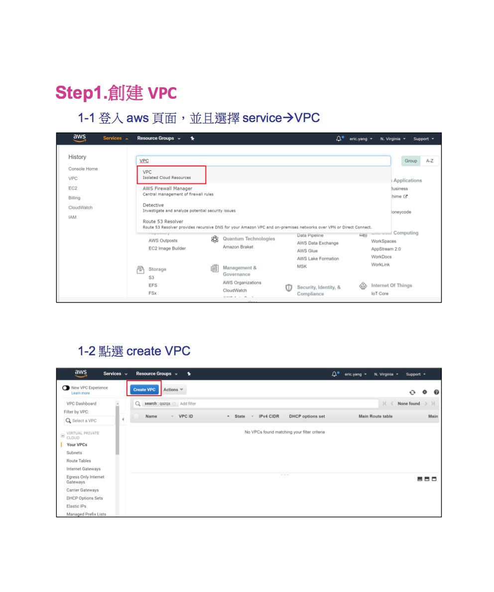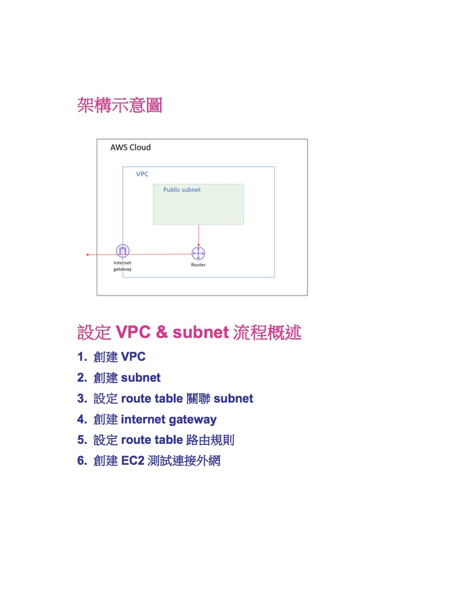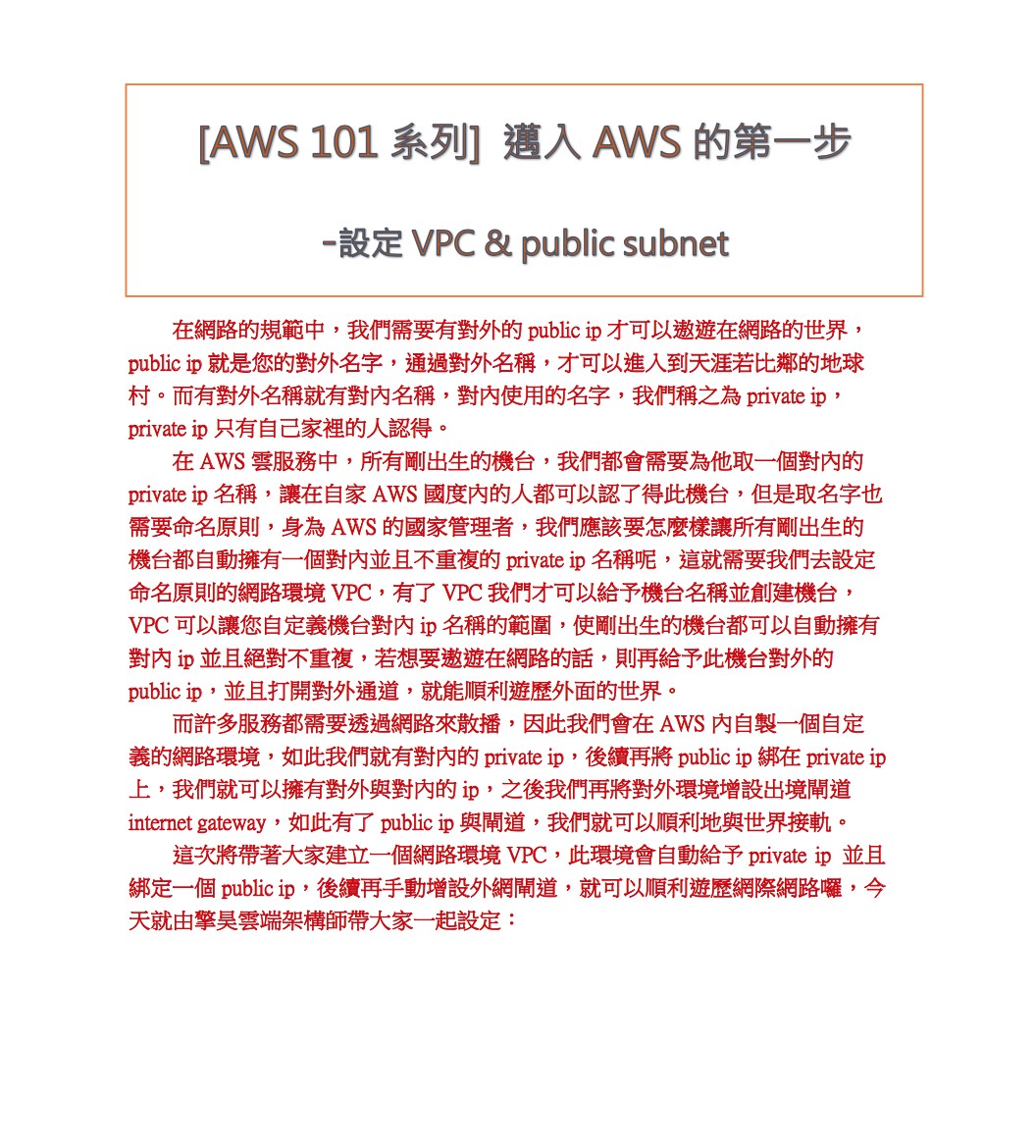在AWS雲服務中,所有剛出生的機台,我們都會需要為他取一個對內的private ip名稱,讓在自家AWS國度內的人都可以認了得此機台,但是取名字也需要命名原則,身為AWS的國家管理者,我們應該要怎麼樣讓所有剛出生的機台都自動擁有一個對內並且不重複的private ip名稱呢?這就需要我們去設定命名原則的網路環境VPC,有了VPC我們才可以給予機台名稱並創建機台,VPC可以讓您自定義機台對內ip名稱的範圍,使剛出生的機台都可以自動擁有對內ip並且絕對不重複,若想要遨遊在網路的話,則再給予此機台對外的public ip,並且打開對外通道,就能順利遊歷外面的世界。