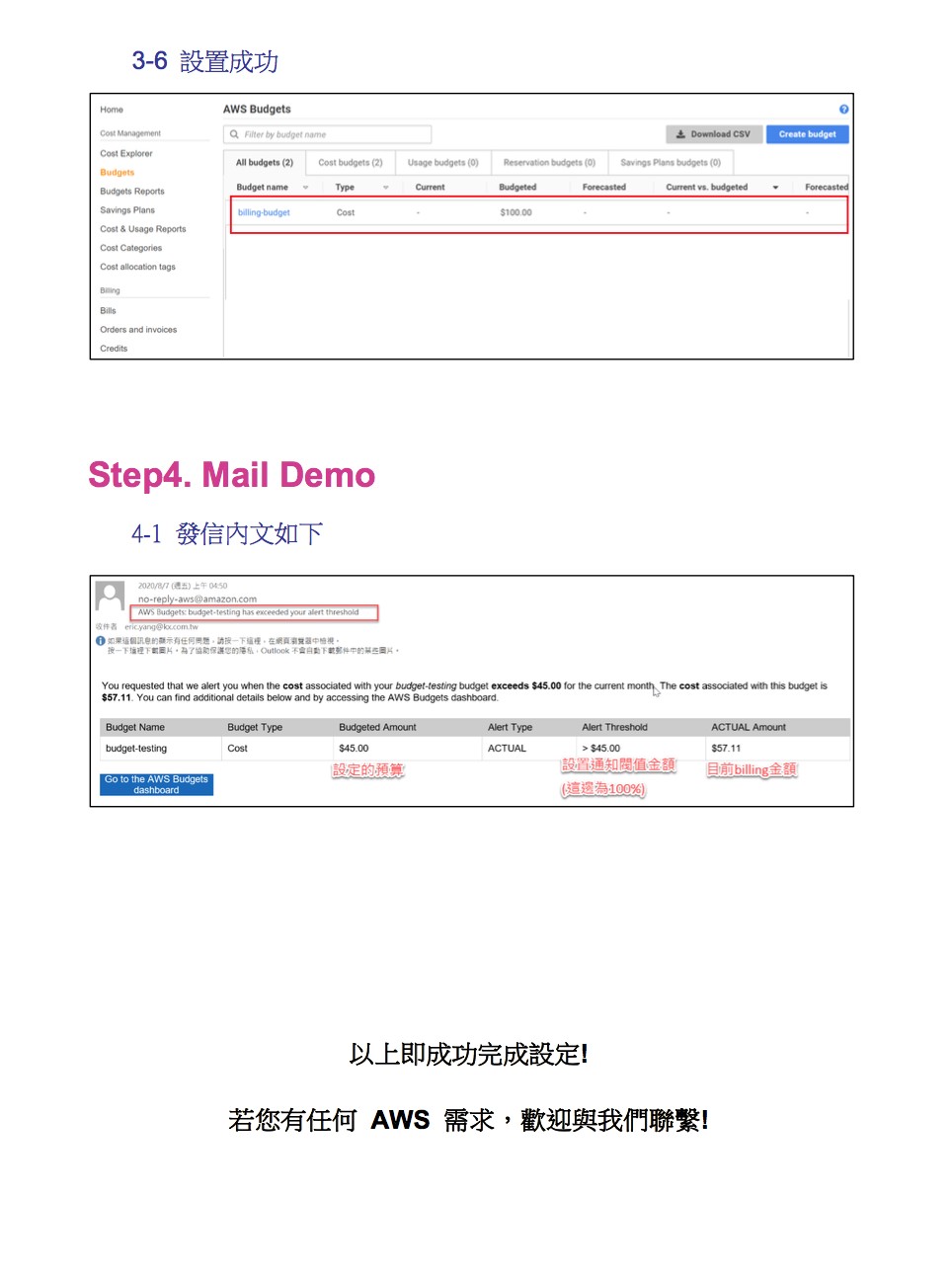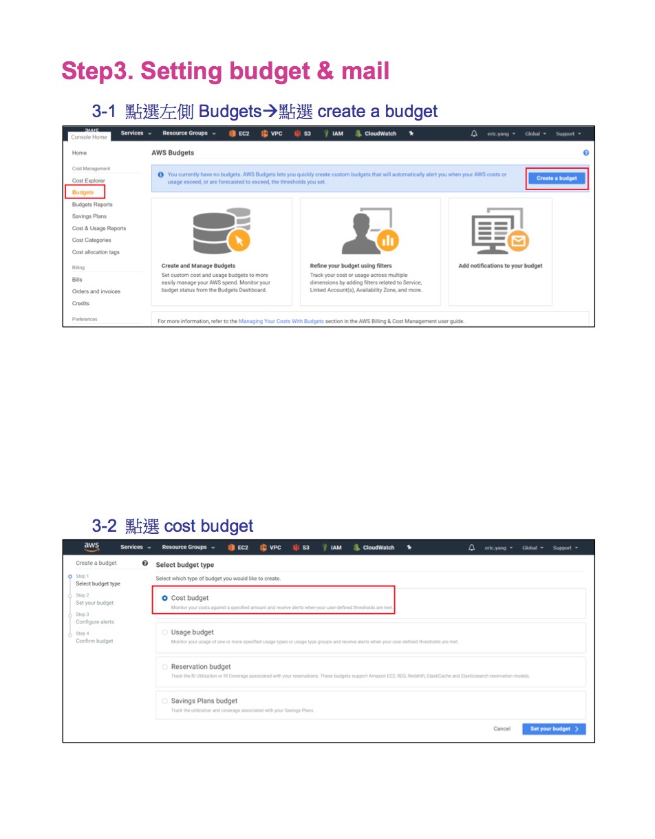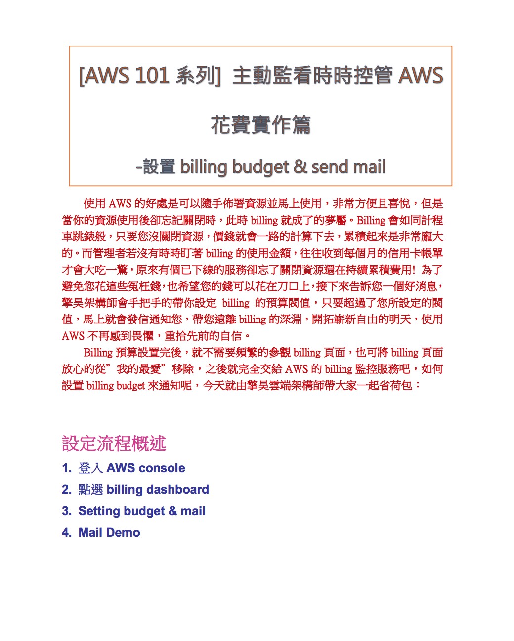 使用AWS的好處是可以隨手佈署資源並馬上使用,非常方便且喜悅,但是當你的資源使用後卻忘記關閉時,此時billing就成了的夢靨。Billing會如同計程車跳錶般,只要您沒關閉資源,價錢就會一路的計算下去,累積起來是非常龐大的。而管理者若沒有時時盯著billing的使用金額,往往收到每個月的信用卡帳單才會大吃一驚,原來有個已下線的服務卻忘了關閉資源還在持續累積費用! 為了避免您花這些冤枉錢,也希望您的錢可以花在刀口上,接下來告訴您一個好消息,擎昊架構師會手把手的帶你設定billing的預算閥值,只要超過了您所設定的閥值,馬上就會發信通知您,帶您遠離billing的深淵,開拓嶄新自由的明天,使用AWS不再感到畏懼,重拾先前的自信。