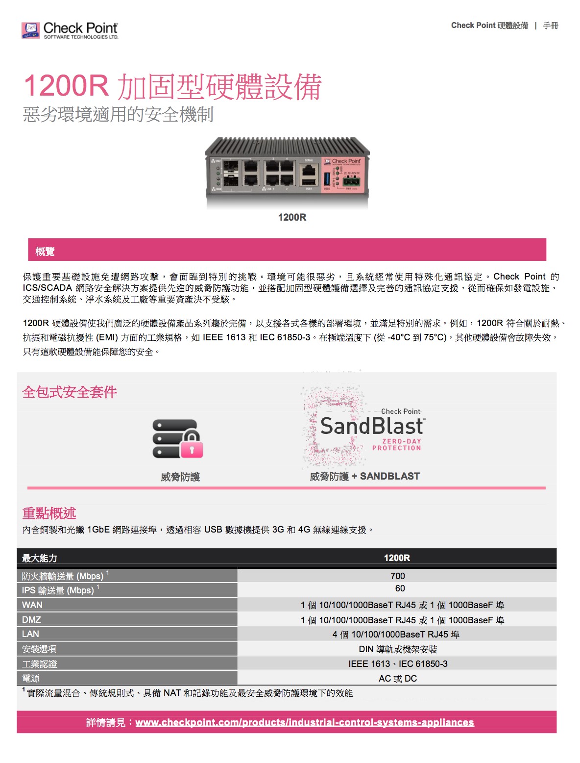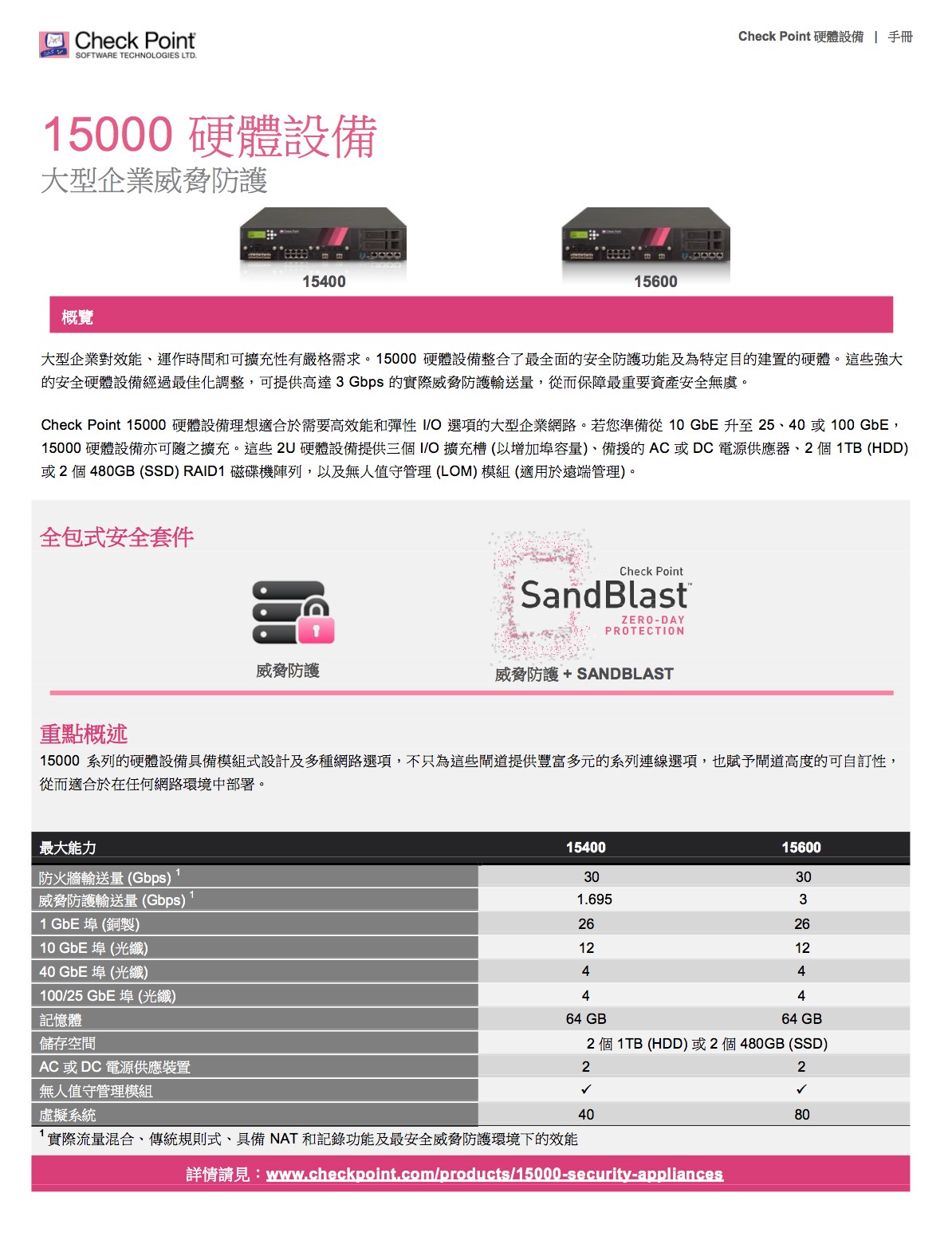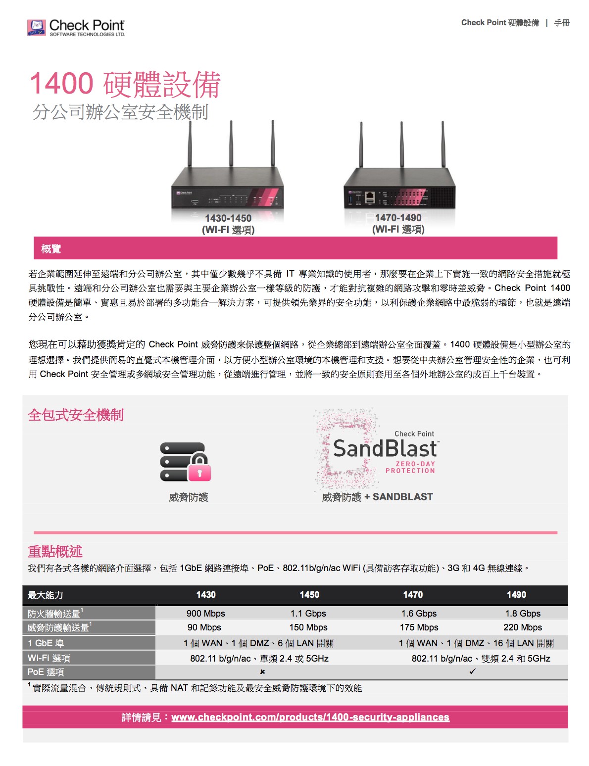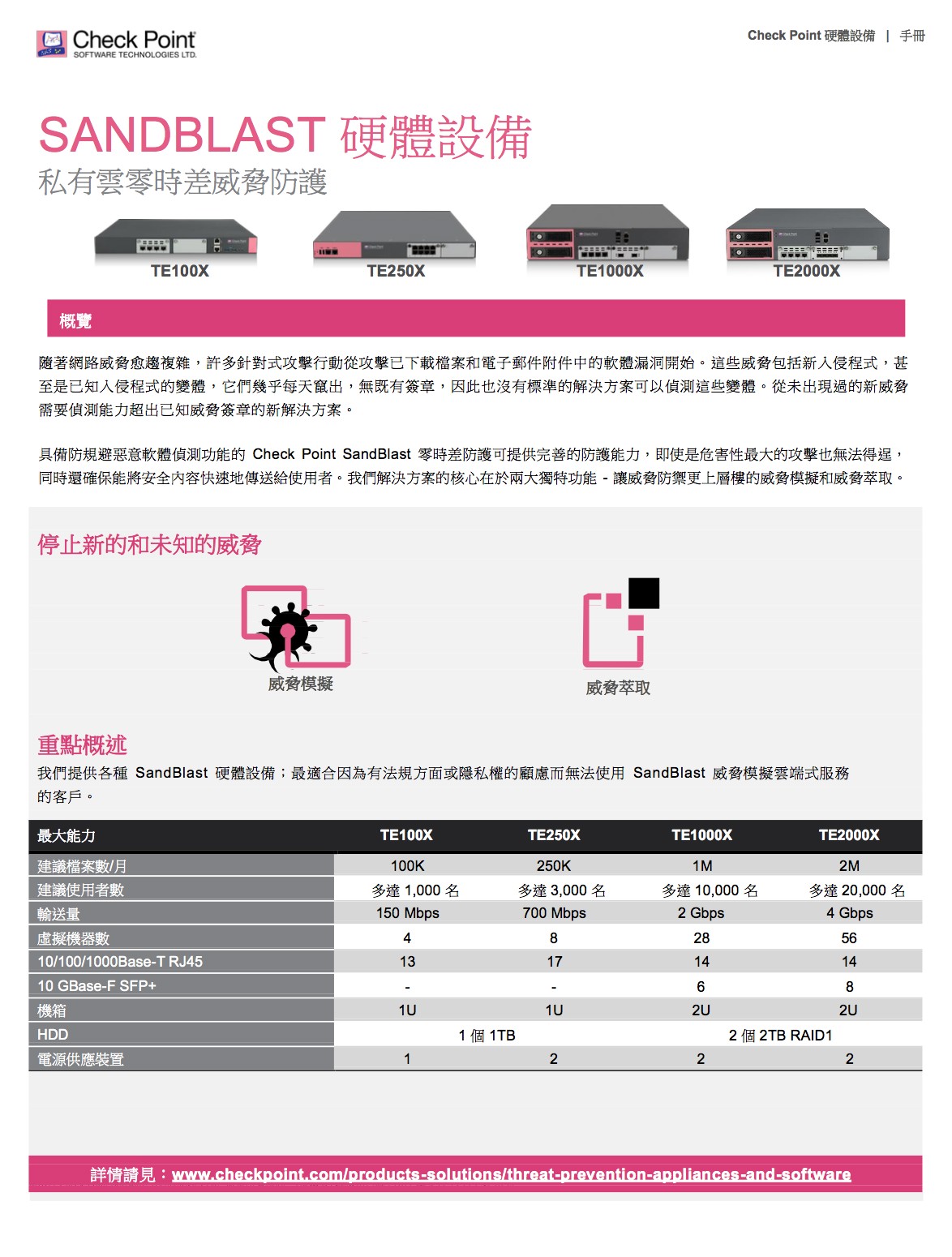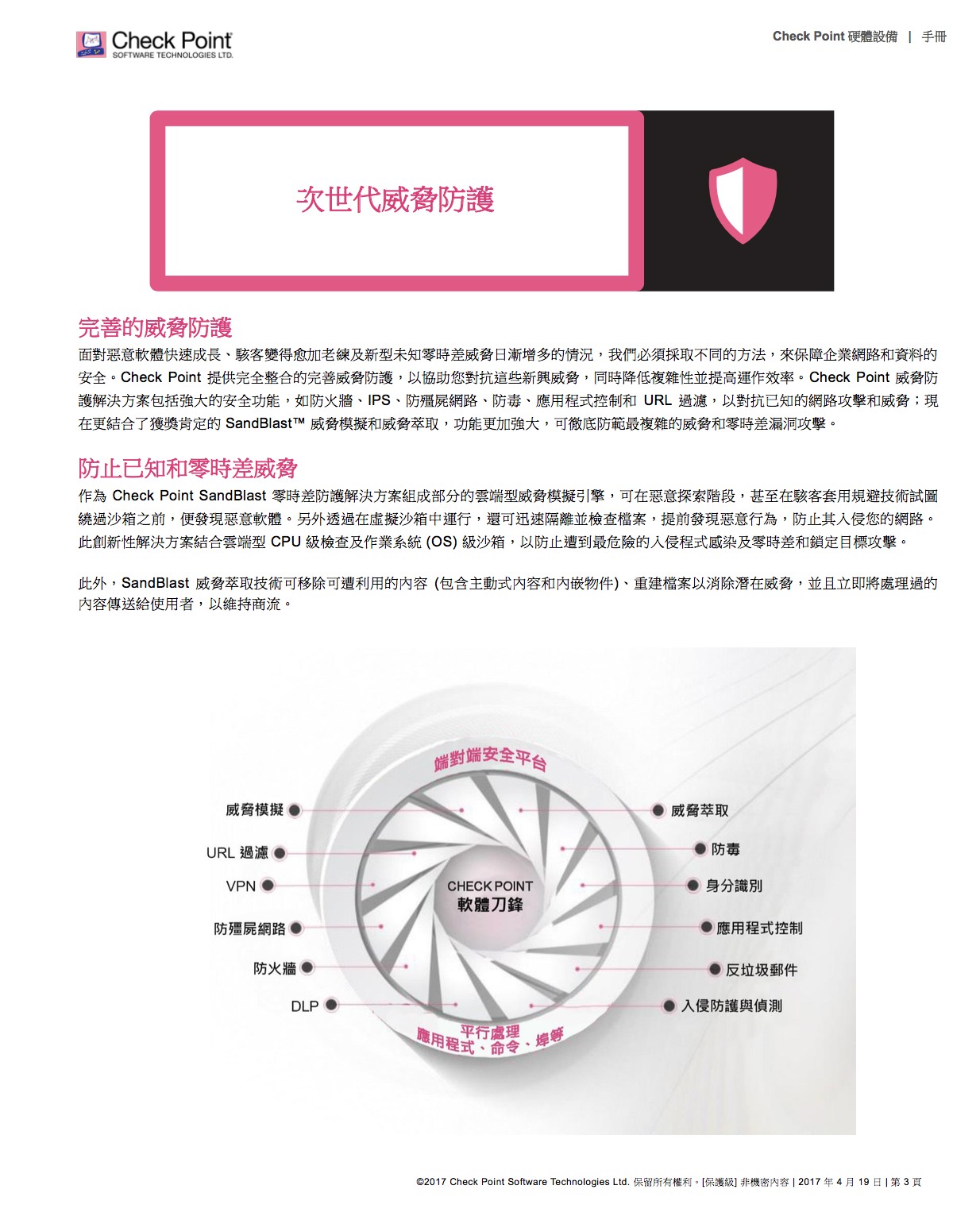 完善的威脅防護,面對惡意軟體快速成長、駭客變得愈加老練及新型未知零時差威脅日漸增多的情況,我們必須採取不同的方法,來保障企業網路和資料的 安全。Check Point 提供完全整合的完善威脅防護,以協助您對抗這些新興威脅,同時降低複雜性並提高運作效率。Check Point 威脅防 護解決方案包括強大的安全功能,如防火牆、IPS、防殭屍網路、防毒、應用程式控制和 URL 過濾,以對抗已知的網路攻擊和威脅;現 在更結合了獲獎肯定的 SandBlastTM 威脅模擬和威脅萃取,功能更加強大,可徹底防範最複雜的威脅和零時差漏洞攻擊。