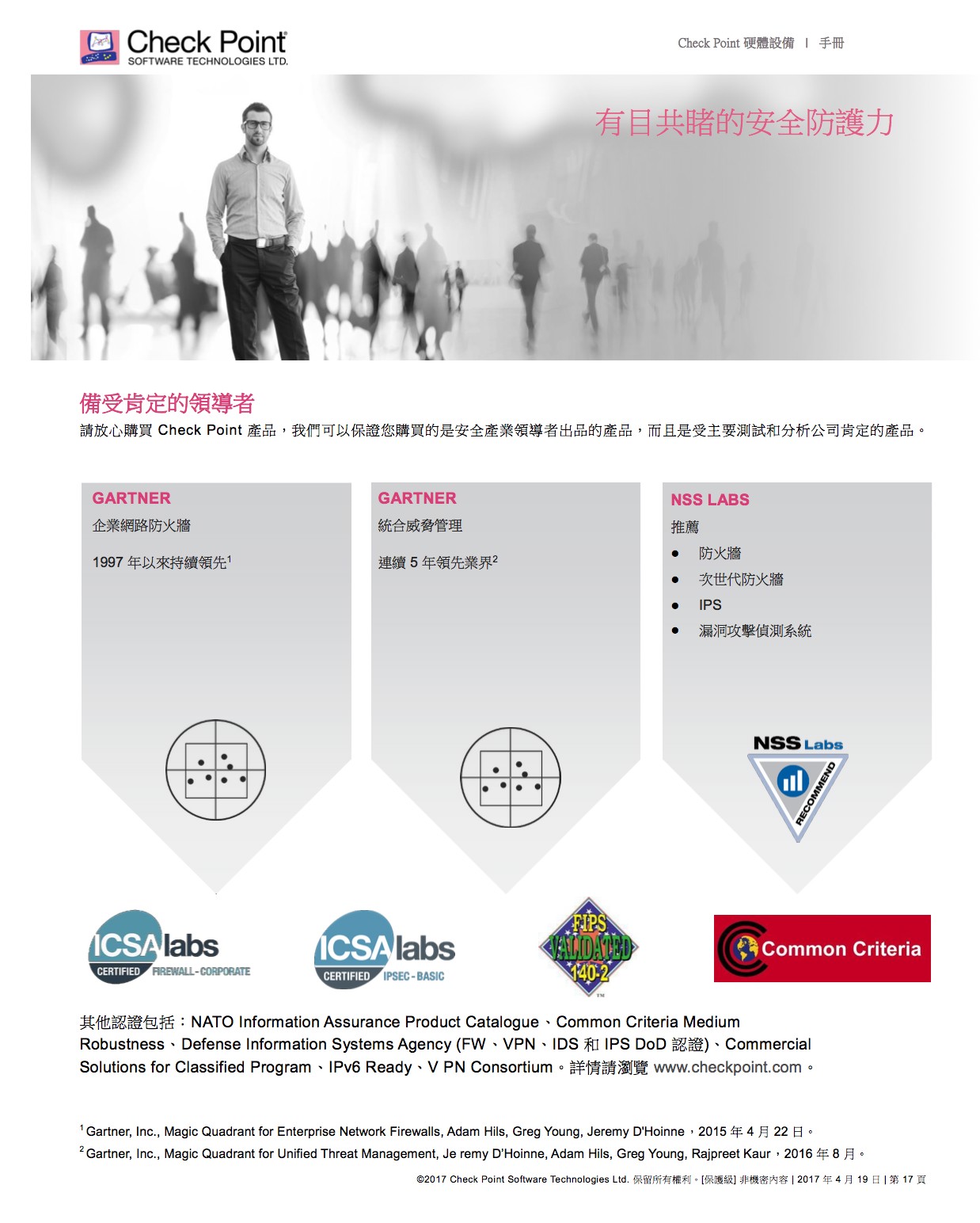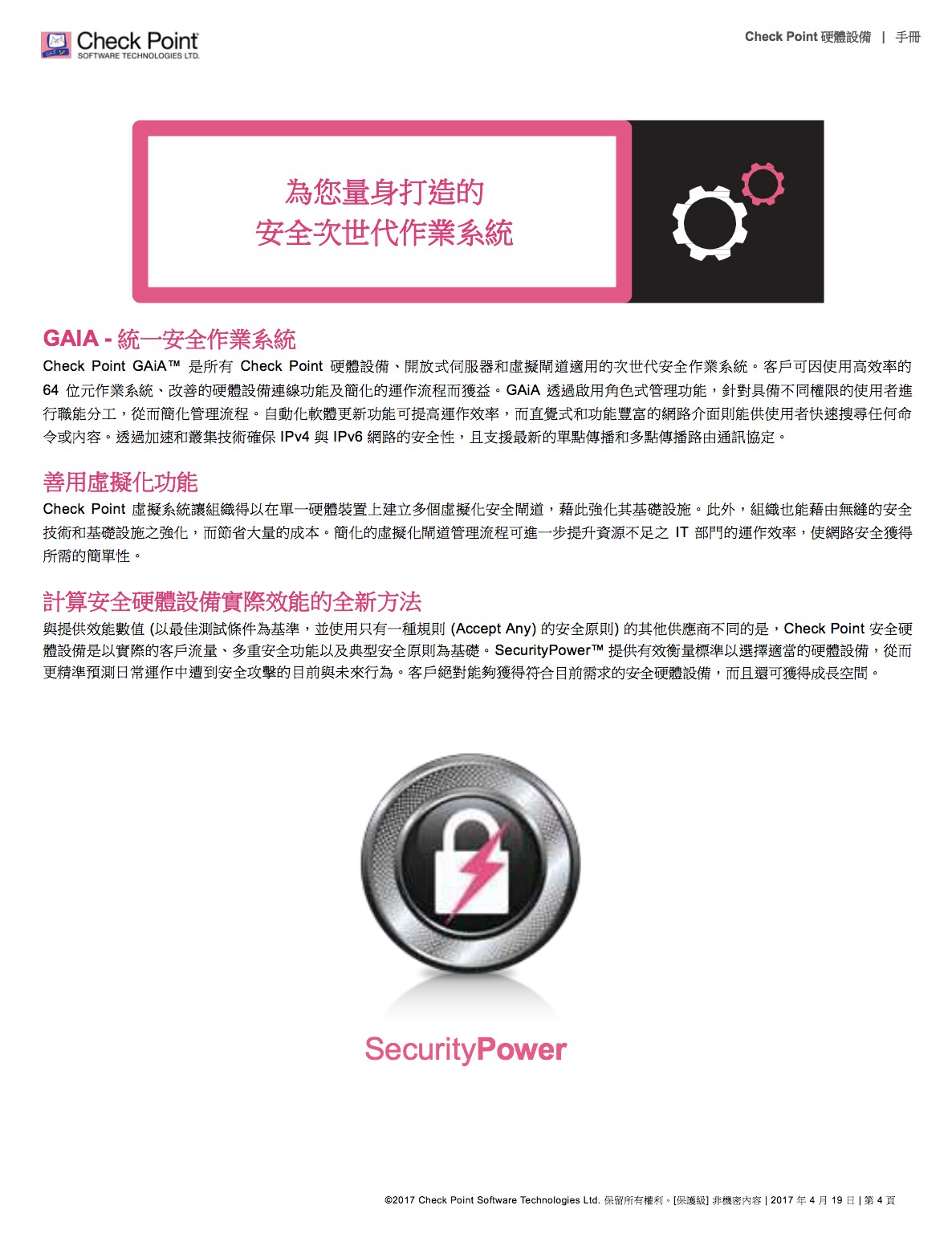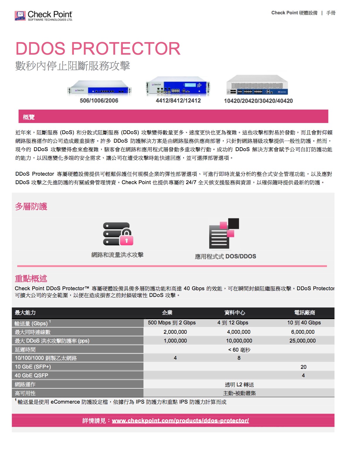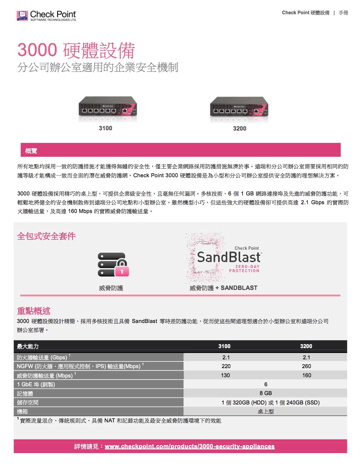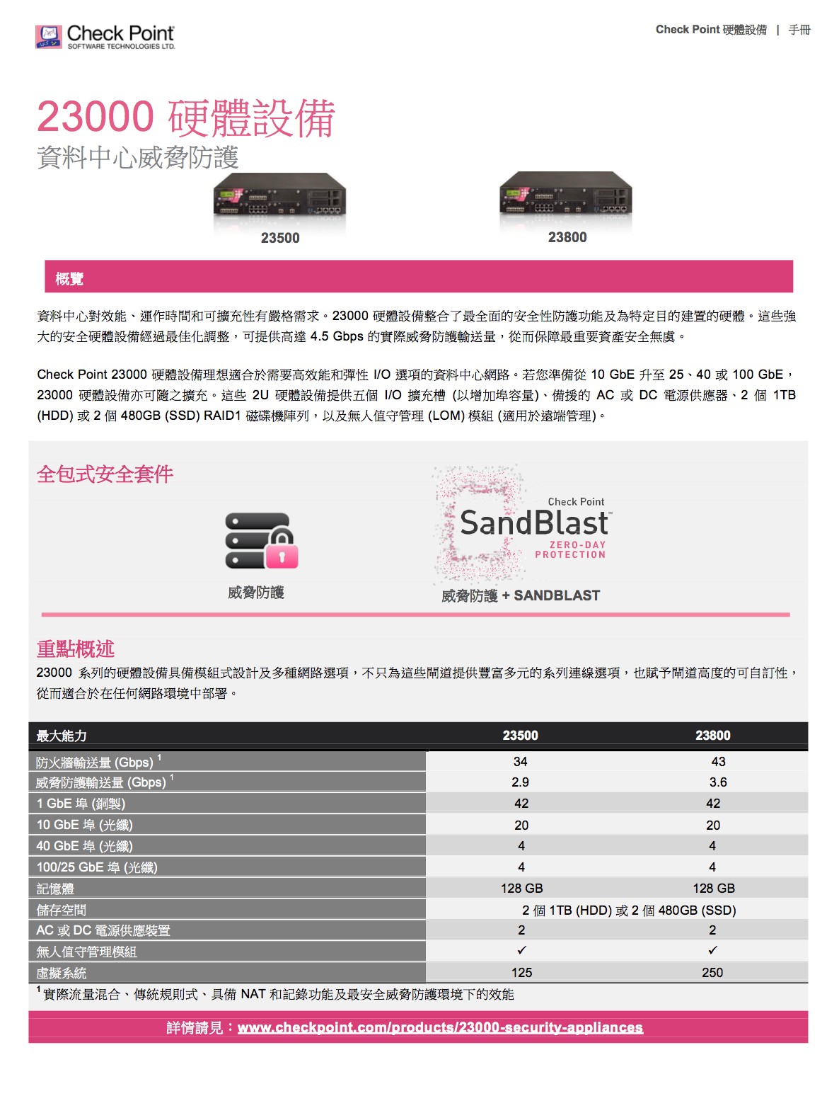 完善的威脅防護,面對惡意軟體快速成長、駭客變得愈加老練及新型未知零時差威脅日漸增多的情況,我們必須採取不同的方法,來保障企業網路和資料的 安全。Check Point 提供完全整合的完善威脅防護,以協助您對抗這些新興威脅,同時降低複雜性並提高運作效率。Check Point 威脅防 護解決方案包括強大的安全功能,如防火牆、IPS、防殭屍網路、防毒、應用程式控制和 URL 過濾,以對抗已知的網路攻擊和威脅;現 在更結合了獲獎肯定的 SandBlastTM 威脅模擬和威脅萃取,功能更加強大,可徹底防範最複雜的威脅和零時差漏洞攻擊。
