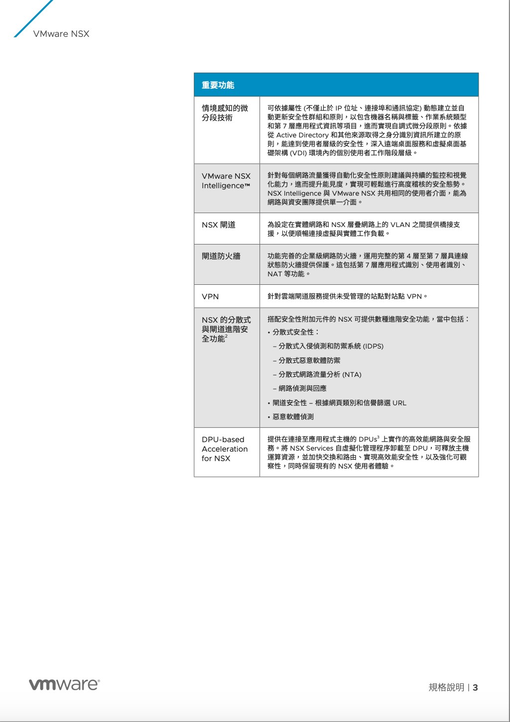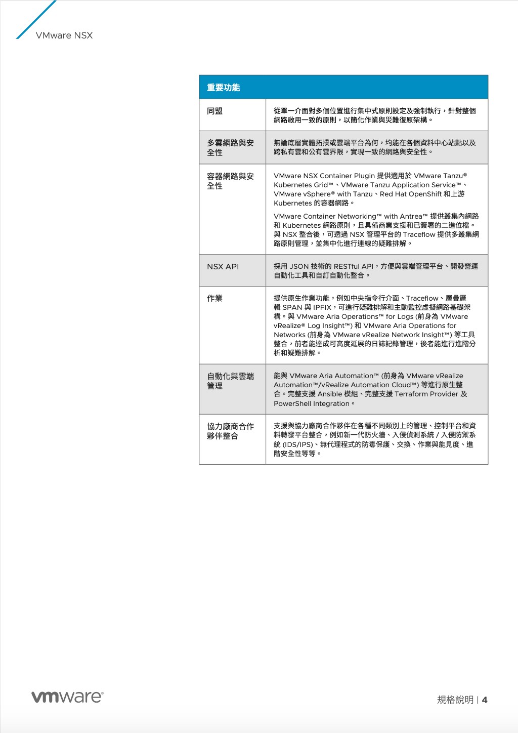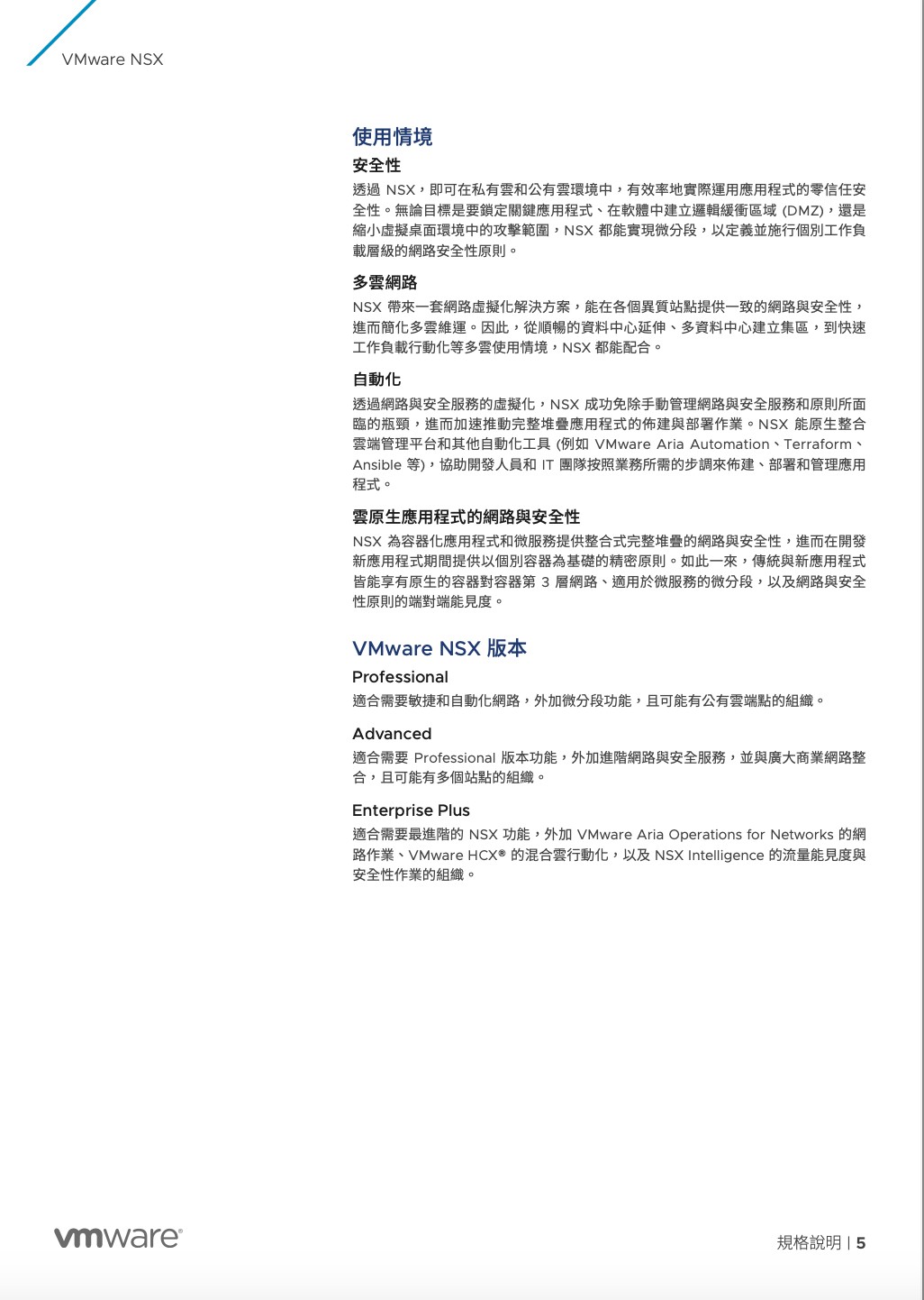 VMware NSX® 是專為軟體定義的資料中心所 打造的網路虛擬化及安全平台,提供整個網路 的虛擬機運作模式。在 NSX 上,包括交換、 路由與防火牆保護在內的網路功能都內嵌在虛 擬化管理程序裡,並分散在環境中。這個模式 有效地建立了「網路虛擬化管理程序」,可以 做為虛擬網路與安全服務的平台。虛擬網路和虛擬機運作模式類似,會透過程式完成佈建與 管理,且不受底層的網路硬體限制。NSX 以 軟體重建整個網路模型,而能夠在幾秒之內建 立和佈建任何網路拓撲,包括從簡單到複雜的 多層級網路。使用者可以利用透過 NSX 提供 的服務組合,建立具有不同需求的多個虛擬網 路,以創造本質上更安全的環境。