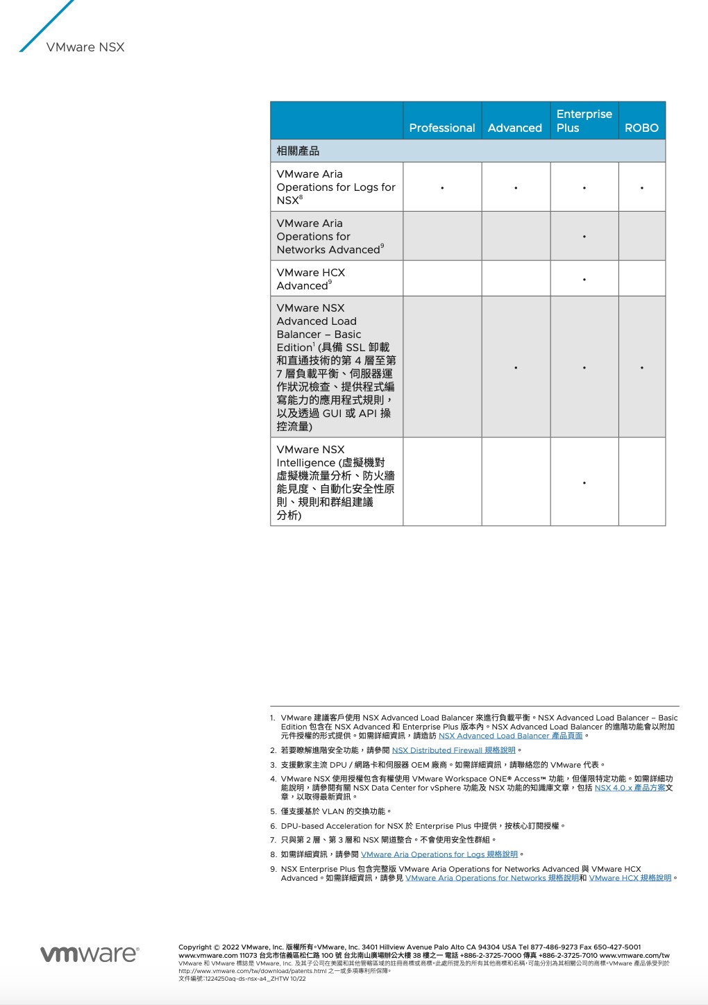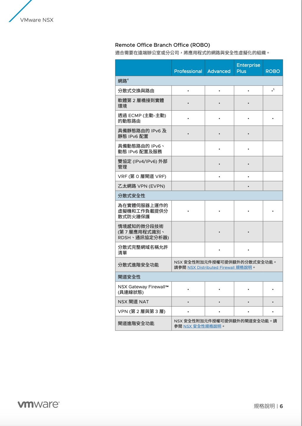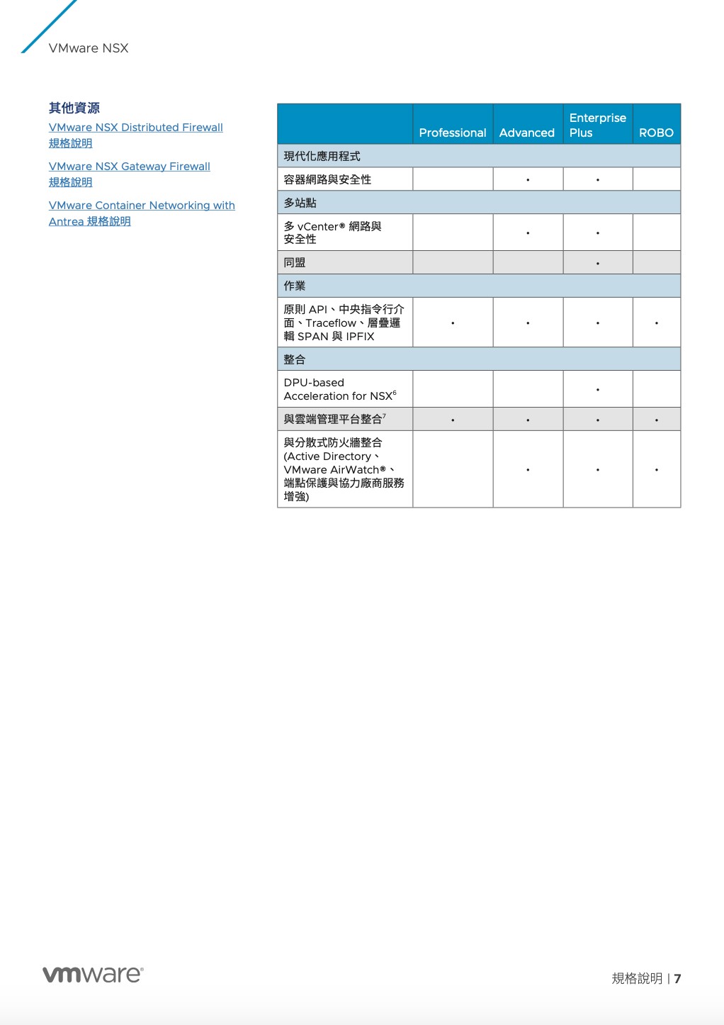 VMware NSX® 是專為軟體定義的資料中心所 打造的網路虛擬化及安全平台,提供整個網路 的虛擬機運作模式。在 NSX 上,包括交換、 路由與防火牆保護在內的網路功能都內嵌在虛 擬化管理程序裡,並分散在環境中。這個模式 有效地建立了「網路虛擬化管理程序」,可以 做為虛擬網路與安全服務的平台。虛擬網路和虛擬機運作模式類似,會透過程式完成佈建與 管理,且不受底層的網路硬體限制。NSX 以 軟體重建整個網路模型,而能夠在幾秒之內建 立和佈建任何網路拓撲,包括從簡單到複雜的 多層級網路。使用者可以利用透過 NSX 提供 的服務組合,建立具有不同需求的多個虛擬網 路,以創造本質上更安全的環境。