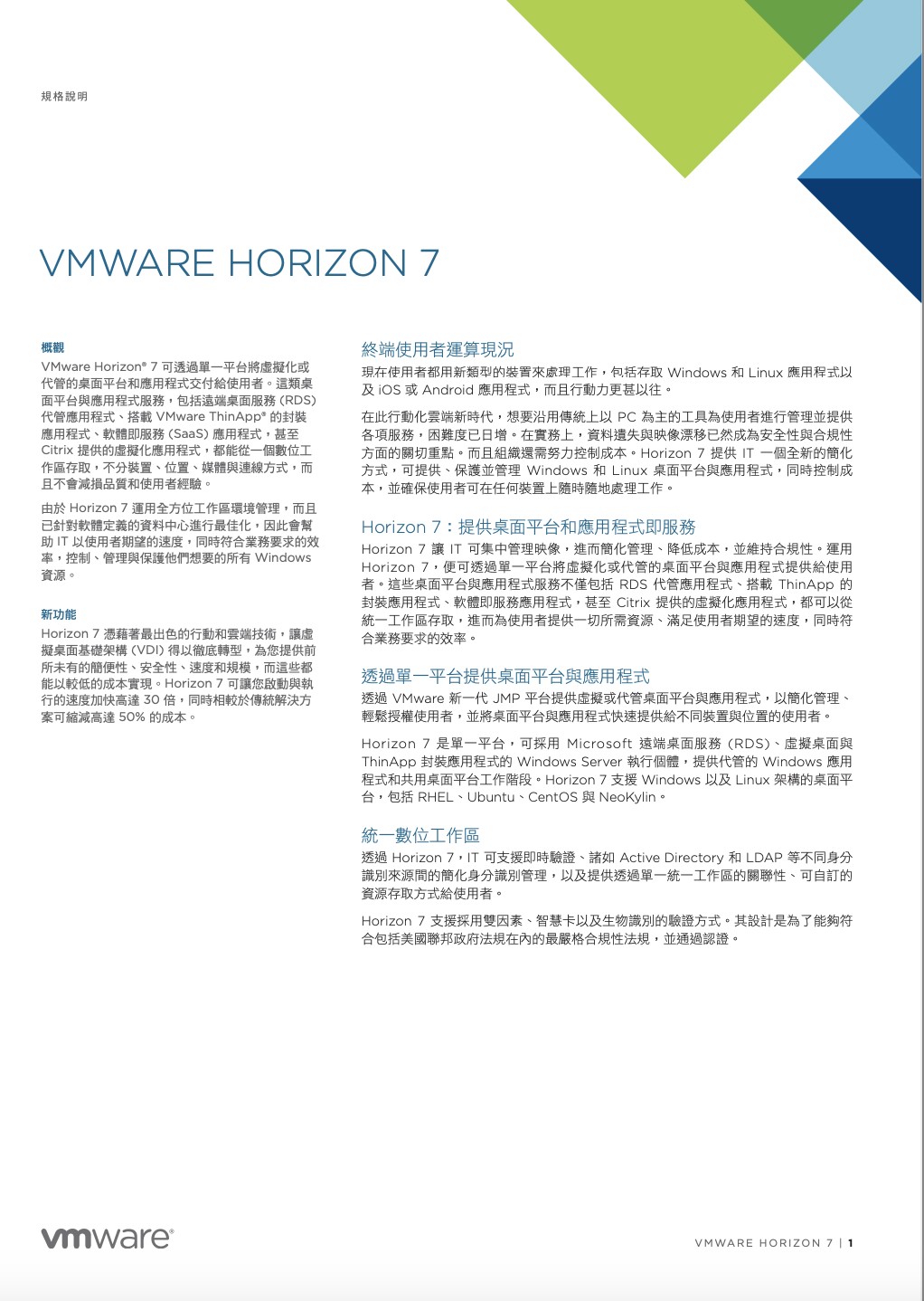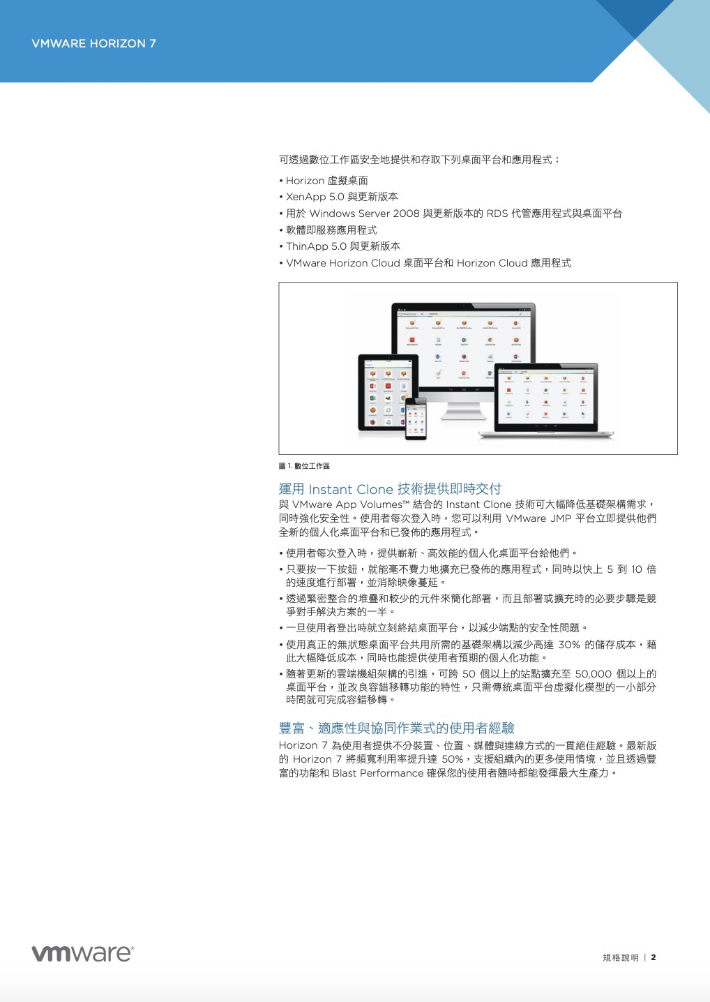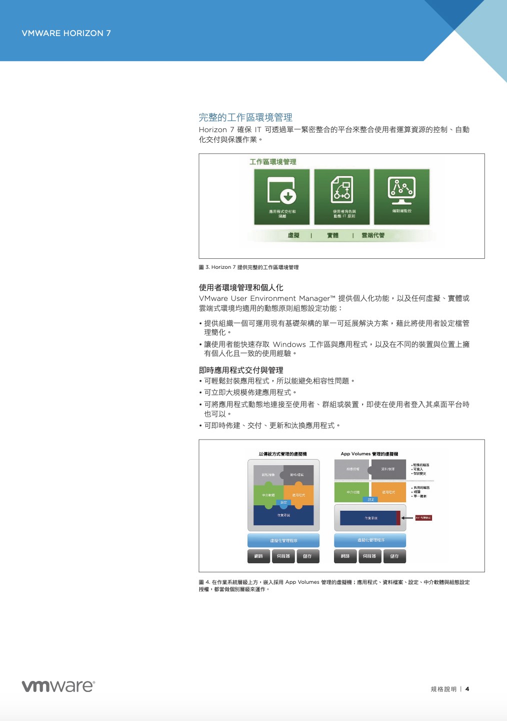 VMware Horizon® 7 可透過單一平台將虛擬化或 代管的桌面平台和應用程式交付給使用者。這類桌 面平台與應用程式服務,包括遠端桌面服務 (RDS) 代管應用程式、搭載 VMware ThinApp® 的封裝 應用程式、軟體即服務 (SaaS) 應用程式,甚至 Citrix 提供的虛擬化應用程式,都能從一個數位工 作區存取,不分裝置、位置、媒體與連線方式,而 且不會減損品質和使用者經驗。 由於 Horizon 7 運用全方位工作區環境管理,而且 已針對軟體定義的資料中心進行最佳化,因此會幫 助 IT 以使用者期望的速度,同時符合業務要求的效 率,控制、管理與保護他們想要的所有 Windows 資源。