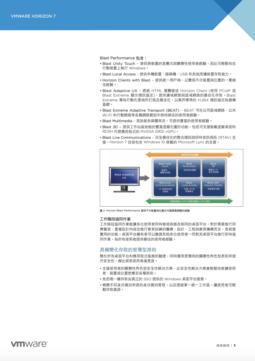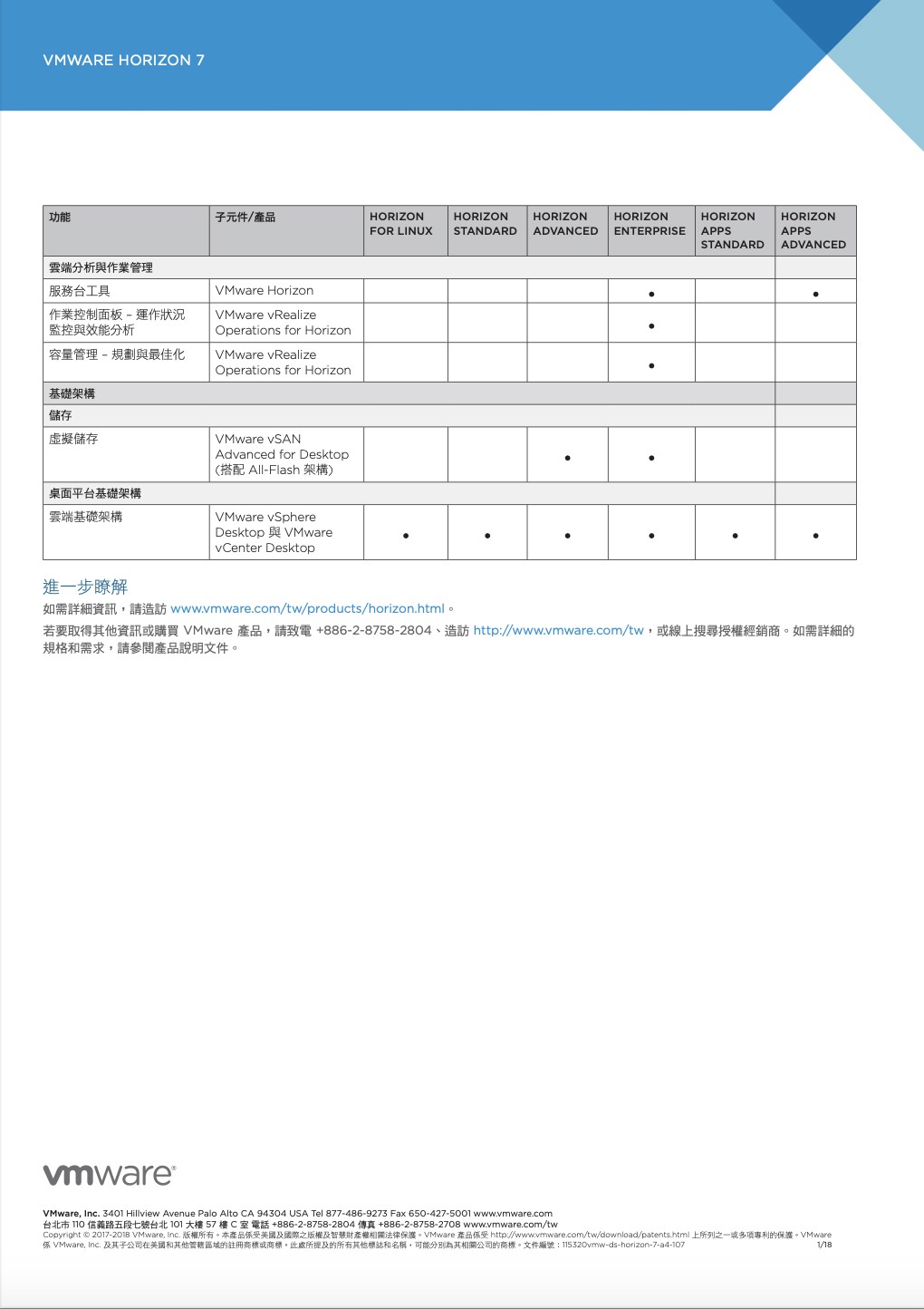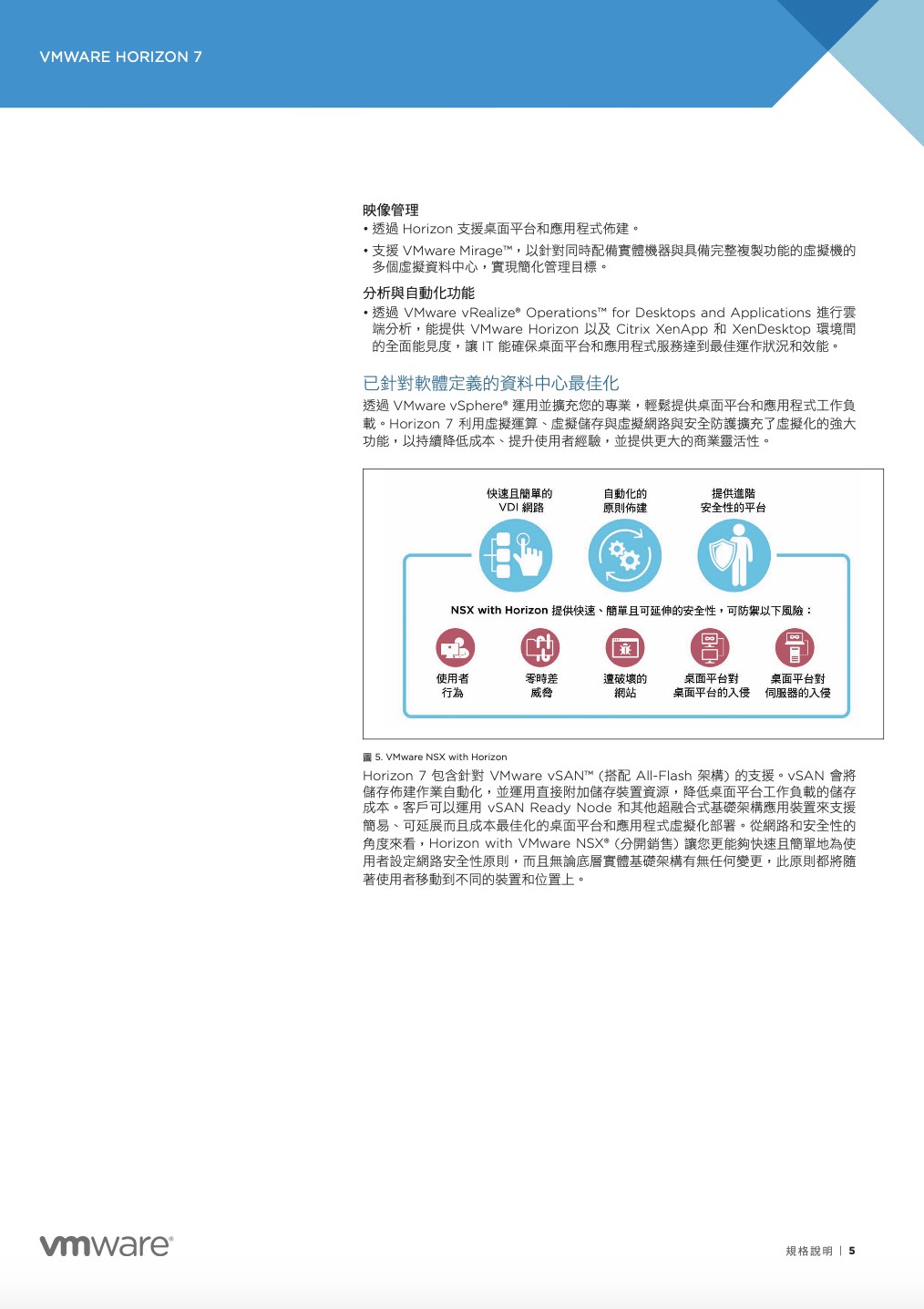 VMware Horizon® 7 可透過單一平台將虛擬化或 代管的桌面平台和應用程式交付給使用者。這類桌 面平台與應用程式服務,包括遠端桌面服務 (RDS) 代管應用程式、搭載 VMware ThinApp® 的封裝 應用程式、軟體即服務 (SaaS) 應用程式,甚至 Citrix 提供的虛擬化應用程式,都能從一個數位工 作區存取,不分裝置、位置、媒體與連線方式,而 且不會減損品質和使用者經驗。 由於 Horizon 7 運用全方位工作區環境管理,而且 已針對軟體定義的資料中心進行最佳化,因此會幫 助 IT 以使用者期望的速度,同時符合業務要求的效 率,控制、管理與保護他們想要的所有 Windows 資源。